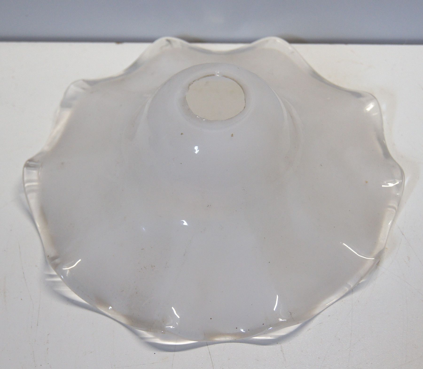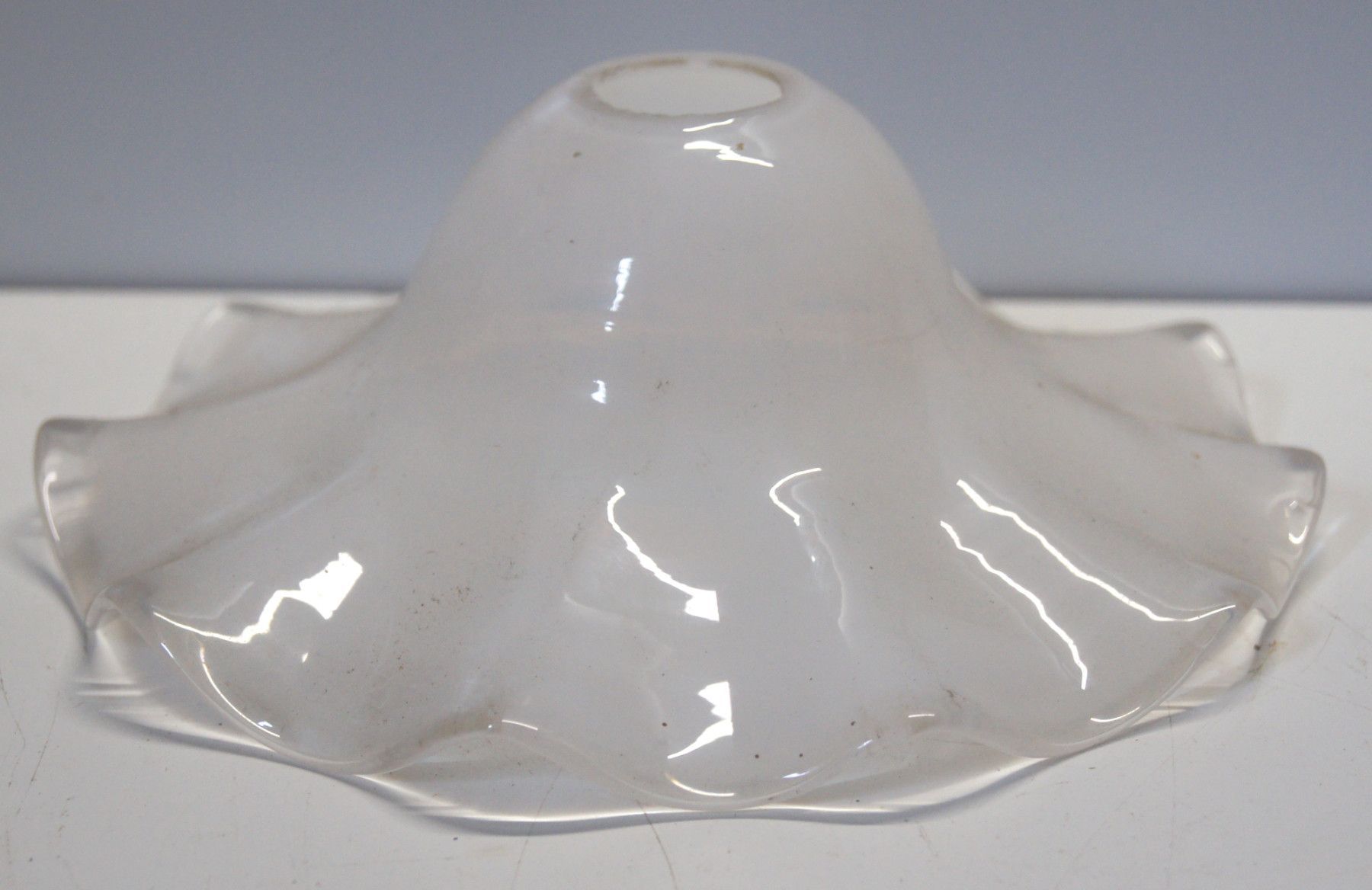 Lampen-Schirm um 1900 (Jugendstil). Ohne Marke. Material: Glas. Der Lampenschirm ist für eine Flurlampe ebenso geeignet wie für eine Tischlampe. Kleiner Abplatzer am Fassungsloch! Maße: H 7, Ø 20, Fassung Ø 2,7 cm. Antikes am Deich - Inh: Oliver Kipp-Trense