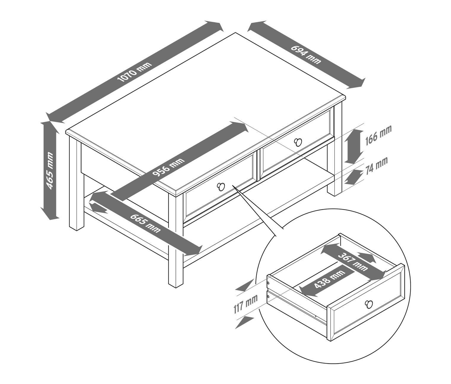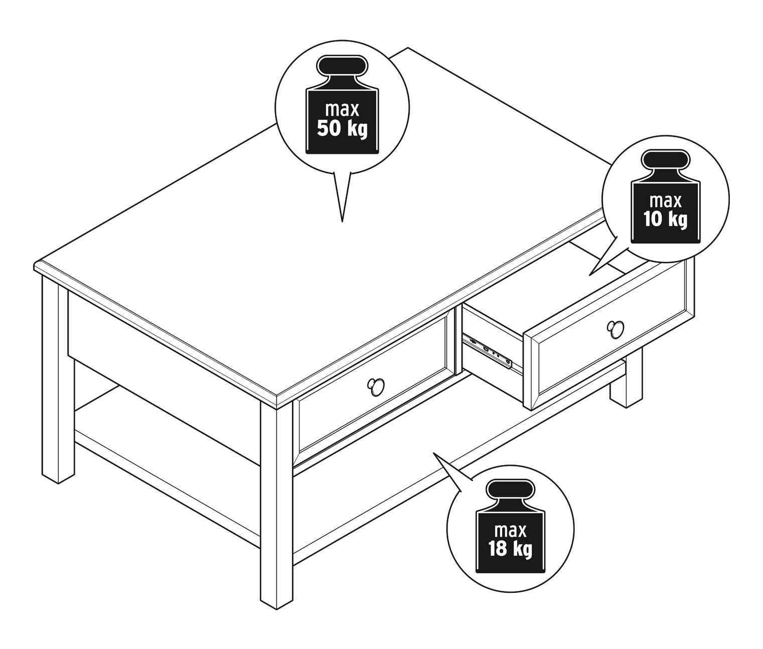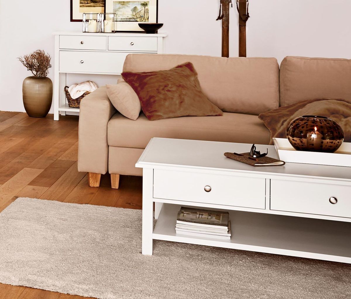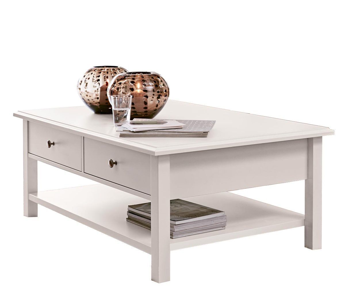 Landhaus Couchtisch Kopenhagen in weiß mit 2 Metallgriffen und 2 großen Schubladen