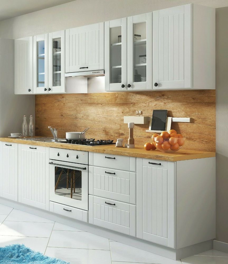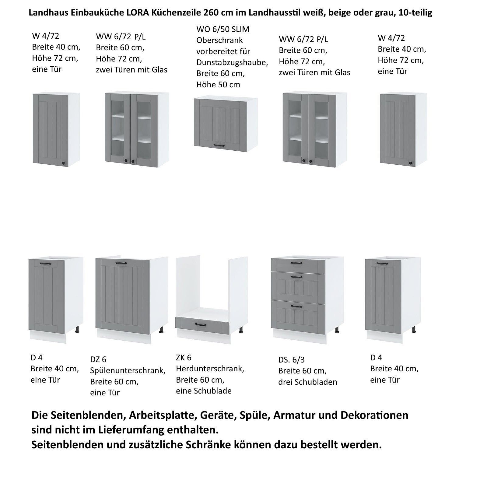 Landhaus Einbauküche LORA Küchenzeile 260 cm im Landhausstil weiß, beige o. grau