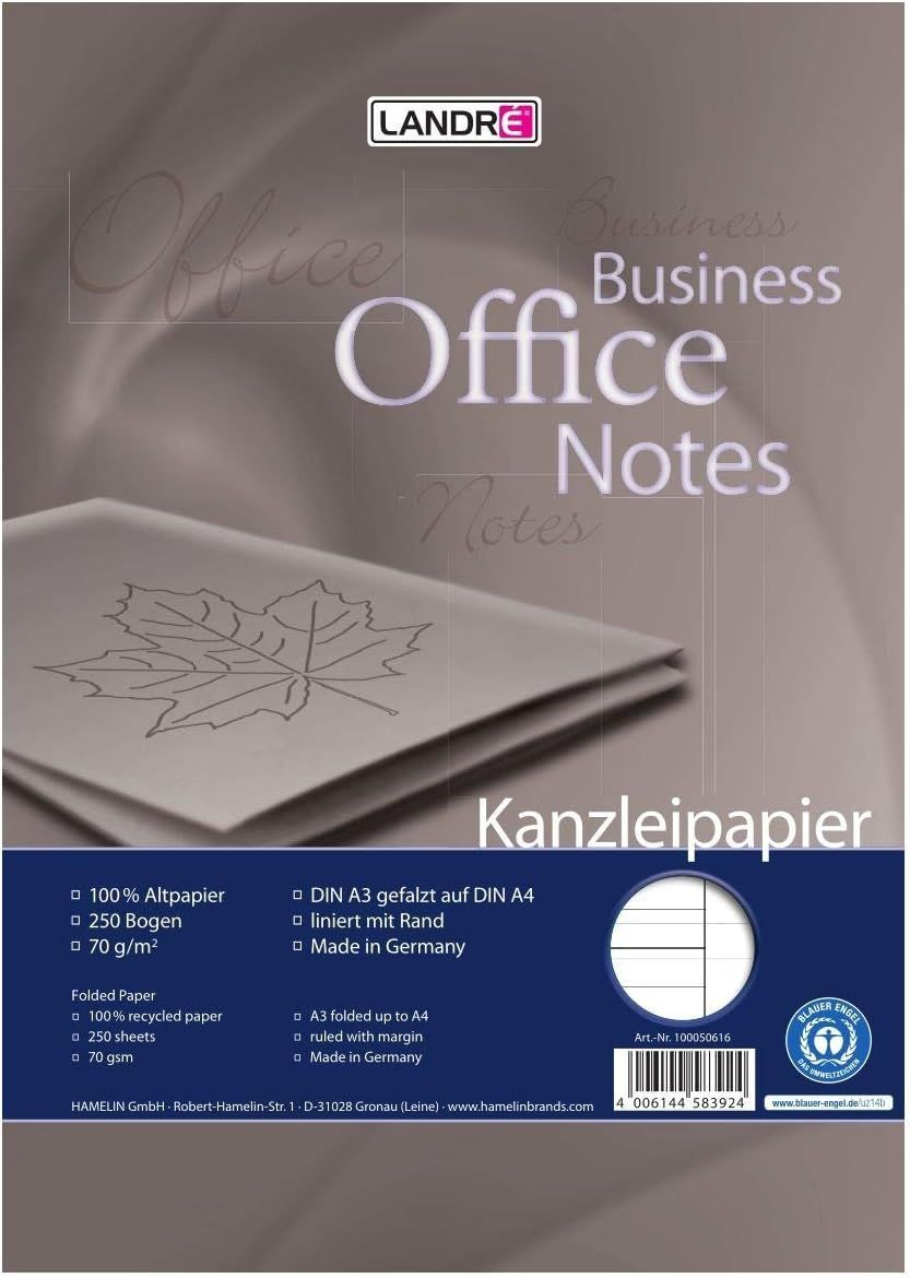 Landré Landré Kanzlei-Papier Recycling A3 auf A4 gefalzt, liniert, 70 g/m², 250 Kanzleibogen