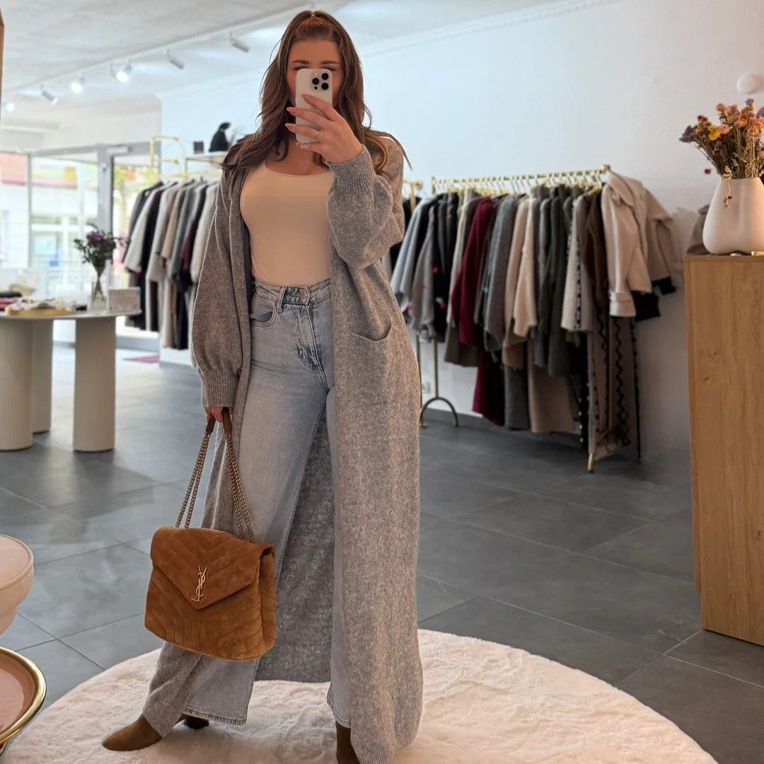Langer Cardigan Strick Damen Lana Grau Onesize XS-XL Frauen Strickjacke Langarm