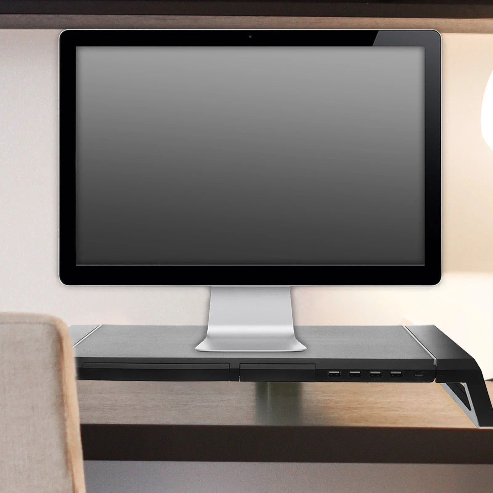 Stylish RGB monitor riser with USB ports — boosts comfort, posture, and workspace organization for home or office.