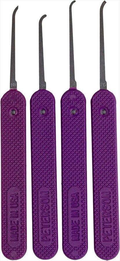 Diese Picks wird aus 0.018 dickem Governmentsteel hergestellt und dann zu einem lila getönten Kunststoffgriff geformt. Dies ist Petersons zweitdünnste Serie von Picks. Sie sind zwar etwas dicker als die 0.015 Picks, aber mit der "Euro" -Schaftreduzierung ausgestattet, um den Austritt in restriktive Schlüsselwege zu verbessern. Sie sind so konzipiert, dass sie für Schlösser mit engen Schlüsselwegen nützlich sind und etwas mehr Festigkeit bieten als die 0,015-Picks.