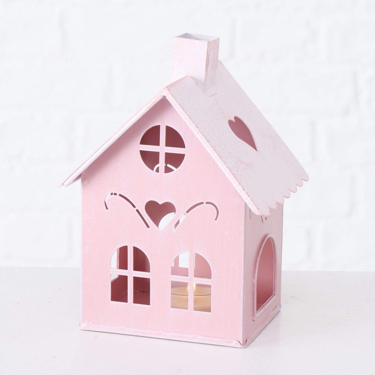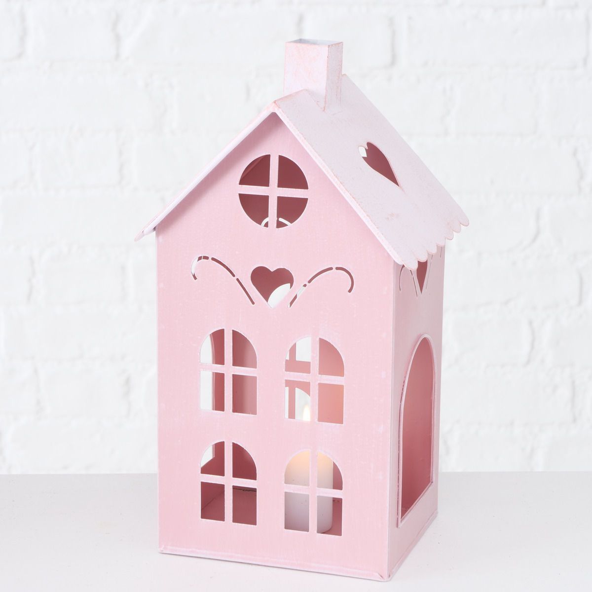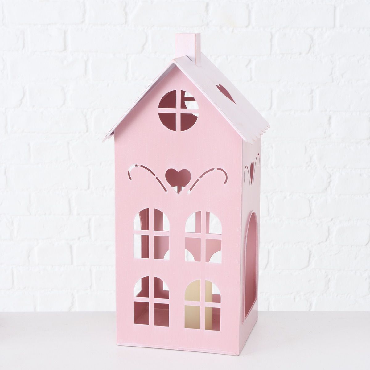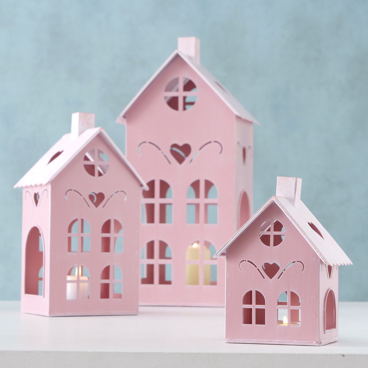 Windlicht in Hausform aus Metall in rosa - 3er Set je 1x 40 / 26 / 17 cm Höhe