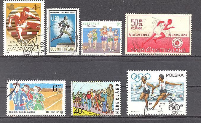 Sport Euro Laufen: 7 Briefm., versch. Länder, gest. siehe Scan Es handelt sich um folgende Marken: Ungarn (Olymp. Spiele 1988) Finnland (In Memoriam Paavo Nurmi), Australien (Fun run) Euro nicht gestempelt Thailand (Asien Games Bangkok 1966), Deutschland (1982, Für den Sport) Niederlande (Wandern) P