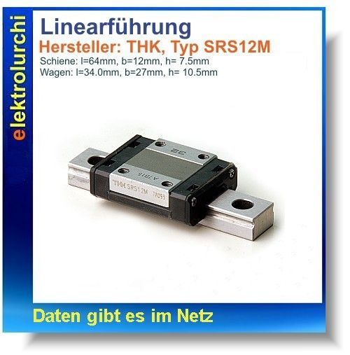 Sie bieten hier auf folgenden Artikel 1 Stück Laufwagen Linearführung, Profilschienenführung Länge 64mm, CNC, THK, SRS12M Komplett mit Schiene und Wagen Bezeichnung: SRS12M Genauigkeitsklasse: hoch Dynamische Tragzahl: 2550 Statische Tragzahl: 4020 N Bauhöhe inkl. Schiene: 13 mm Vorspannung: leicht