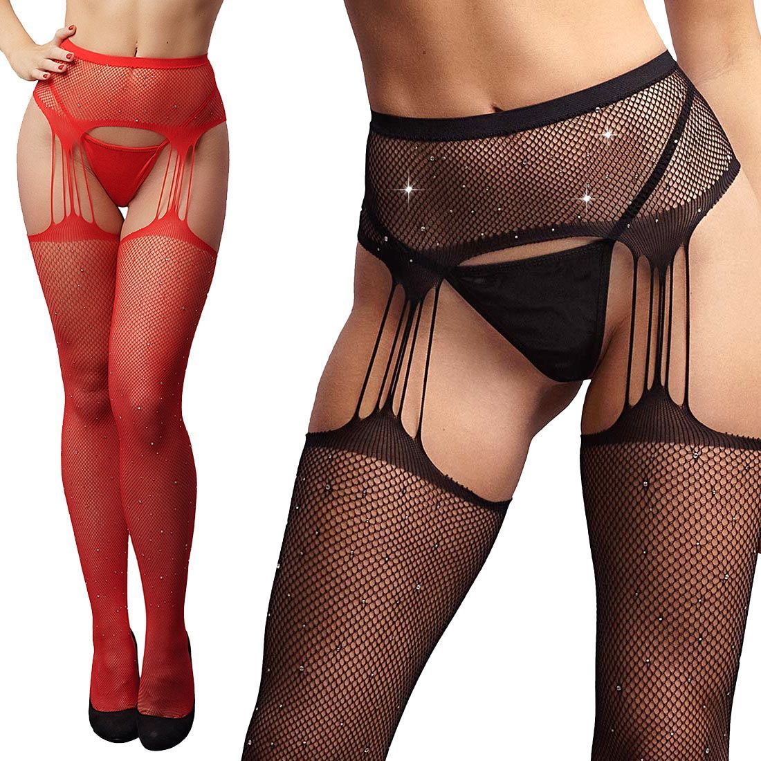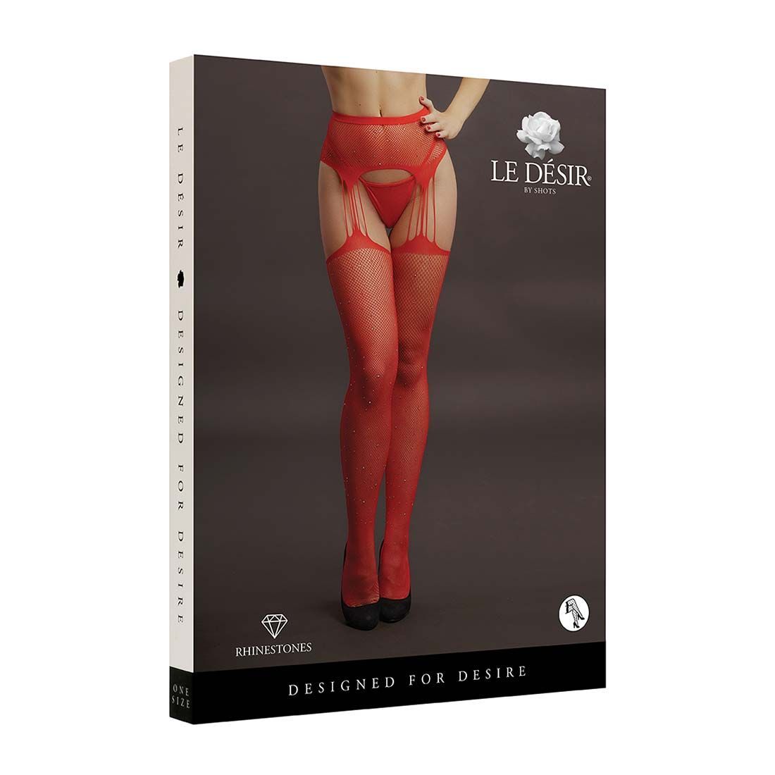 Le Desir sexy Straps-Strumpfhose S M L mit Strass schwarz rot Dessous offen "X31