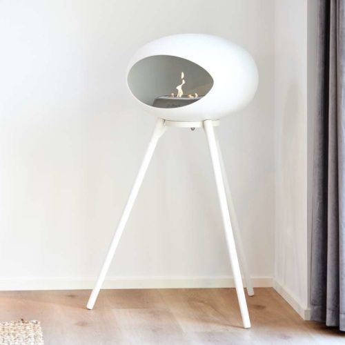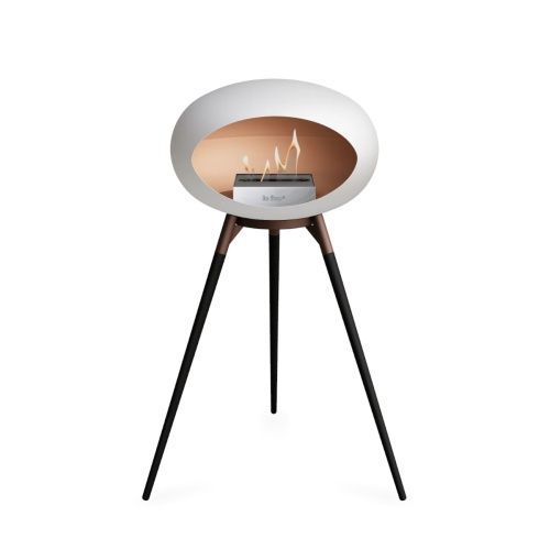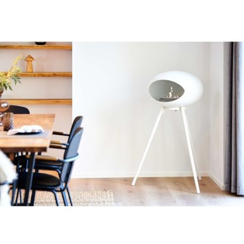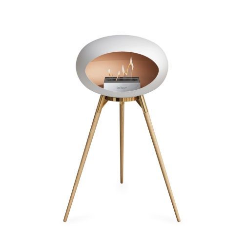 Design-Ethanolkamin mit weißer Dome Kuppel und 79?cm hohen Beinen aus Holz oder Metall. Emissionsfrei, stilvoll & sicher – für stilvolle Wärme in jedem Raum