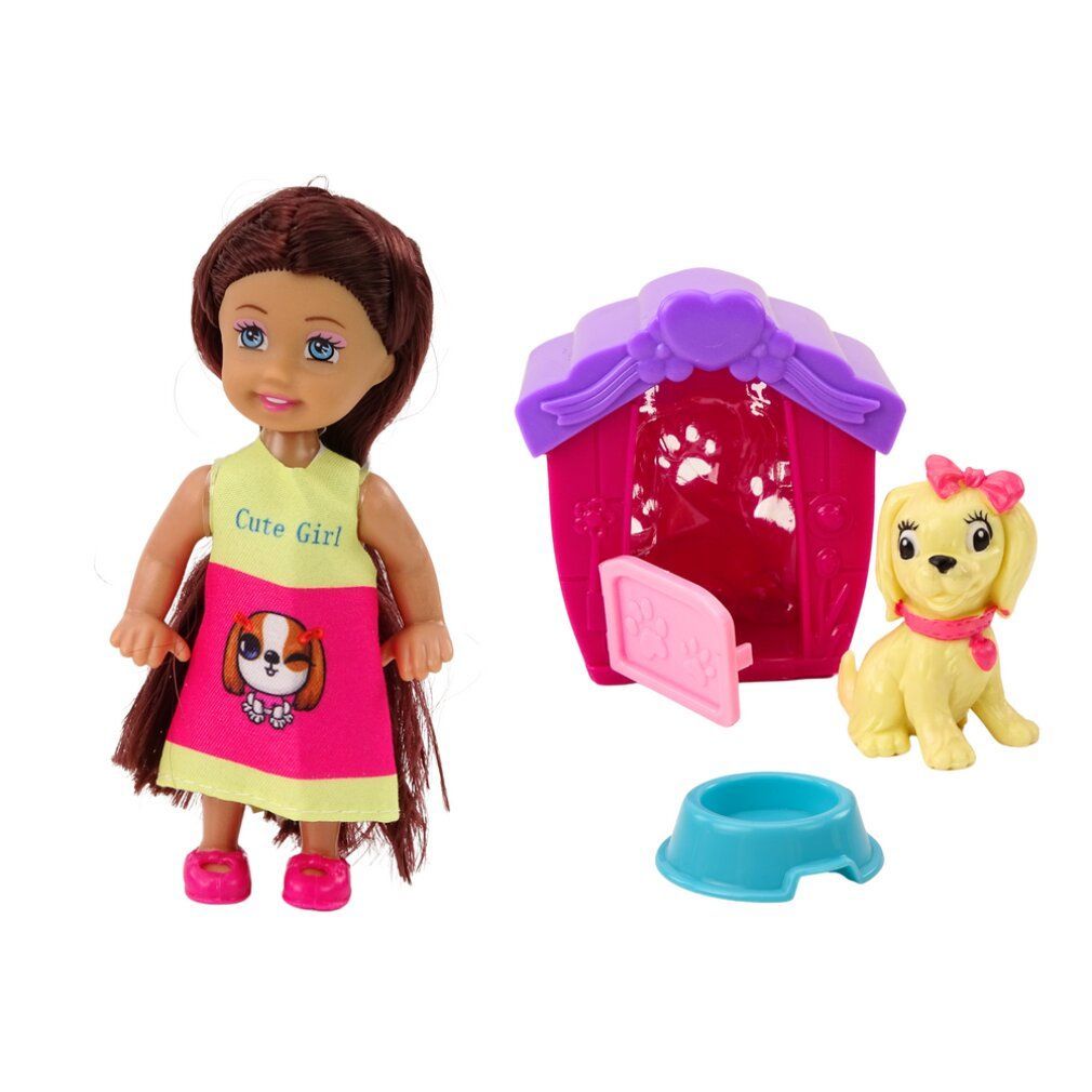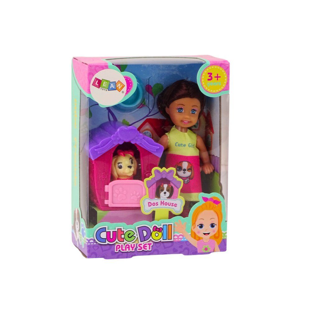 Leantoys Mini Laleczka D?ugie W?osy Sukienka Kolorowa Piesek Buda