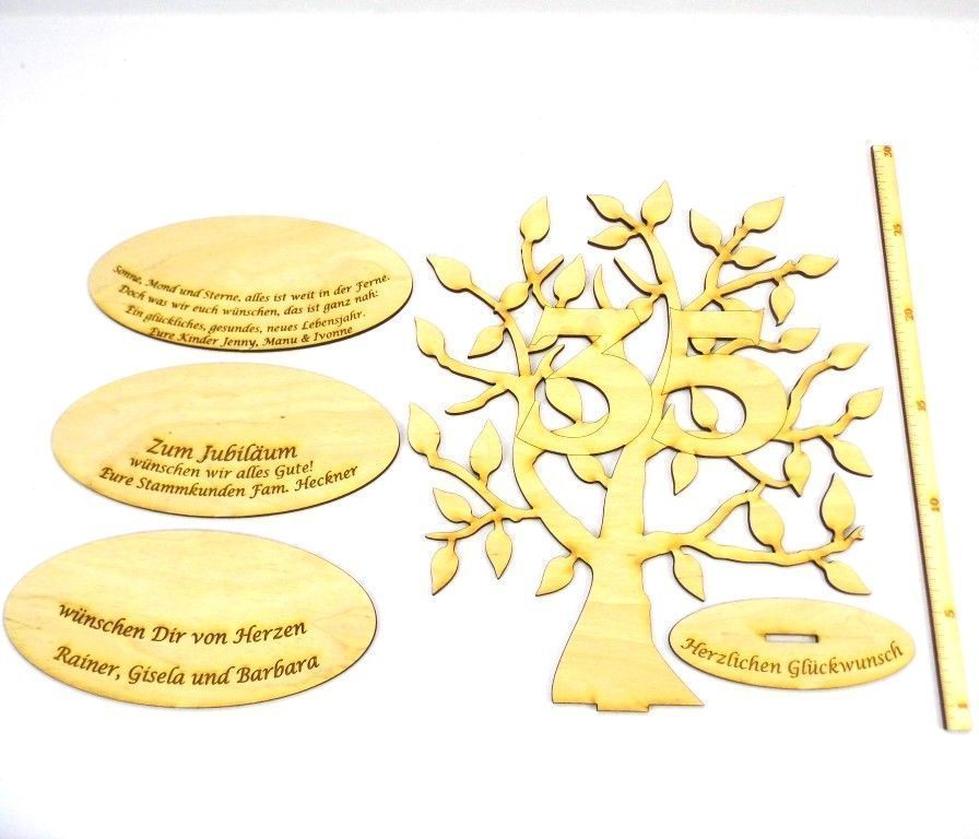 Lebensbaum mit der Zahl 35 und 2 Unterplatten, eine davon mit Ihrer Wunschgravur. Ein originelles und herzliches Geschenk zum Geburtstag. Eine Unterplatte hat die Gravur Herzlichen Glückwunsch, auf der zweiten Platte wird Ihre Wunschgravur in 2, 3, oder 4 Zeilen verfasst. Bitte teilen Sie uns nach der Bestellung Ihre Gravurdaten mit. Anzahl: 1 Stück Größe Baum: 24 cm x 28 cm Größe Unterplatte: 17,4 cm Material: 3 mm dickes Birkenholz Farbe: Natur