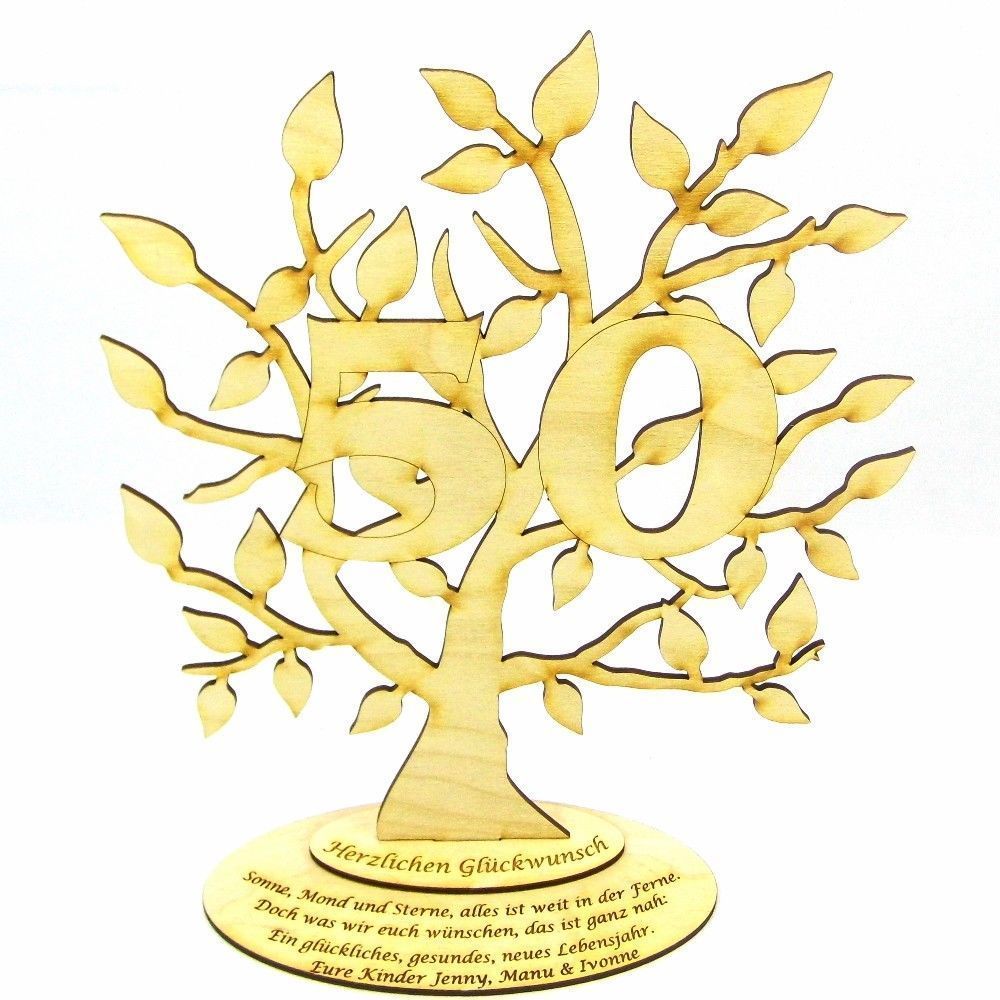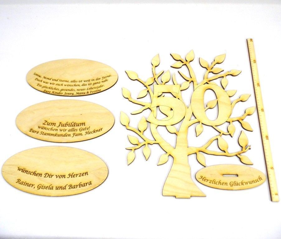 Lebensbaum mit der Zahl 50 und 2 Unterplatten, eine davon mit Ihrer Wunschgravur. Ein originelles und herzliches Geschenk zum Geburtstag. Eine Unterplatte hat die Gravur Herzlichen Glückwunsch, auf der zweiten Platte wird Ihre Wunschgravur in 2, 3, oder 4 Zeilen verfasst. Bitte teilen Sie uns nach der Bestellung Ihre Gravurdaten mit. Anzahl: 1 Stück Größe Baum: 24 cm x 28 cm Größe Unterplatte: 17,4 cm Material: 3 mm dickes Birkenholz Farbe: Natur