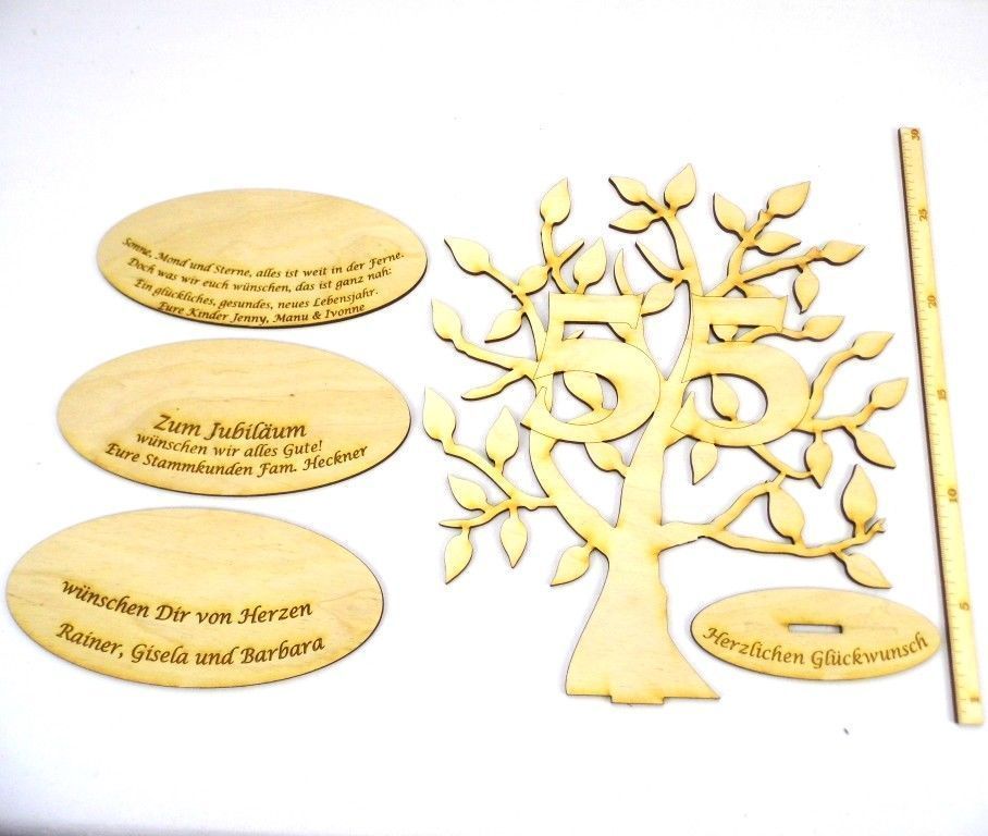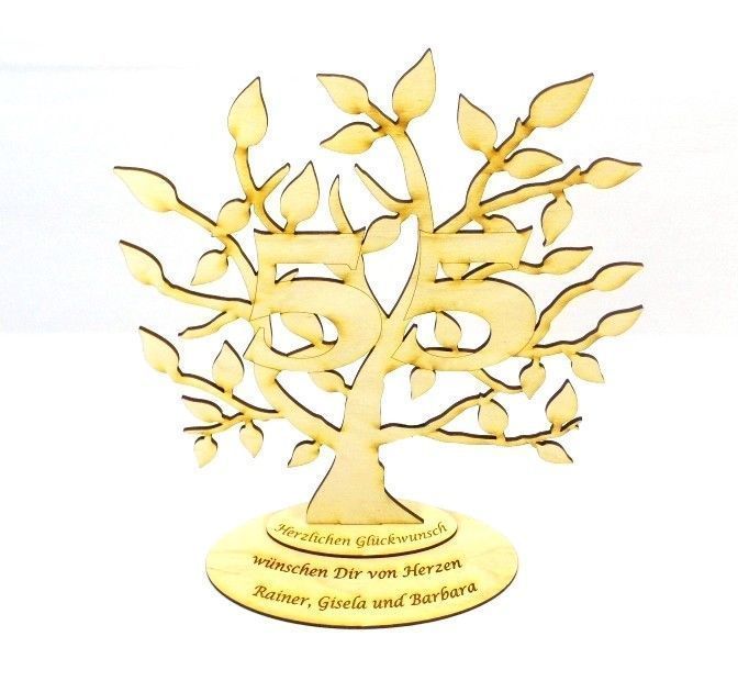 Lebensbaum mit der Zahl 55 und 2 Unterplatten, eine davon mit Ihrer Wunschgravur. Ein originelles und herzliches Geschenk zum Geburtstag. Eine Unterplatte hat die Gravur Herzlichen Glückwunsch, auf der zweiten Platte wird Ihre Wunschgravur in 2, 3, oder 4 Zeilen verfasst. Bitte teilen Sie uns nach der Bestellung Ihre Gravurdaten mit. Anzahl: 1 Stück Größe Baum: 24 cm x 28 cm Größe Unterplatte: 17,4 cm Material: 3 mm dickes Birkenholz Farbe: Natur