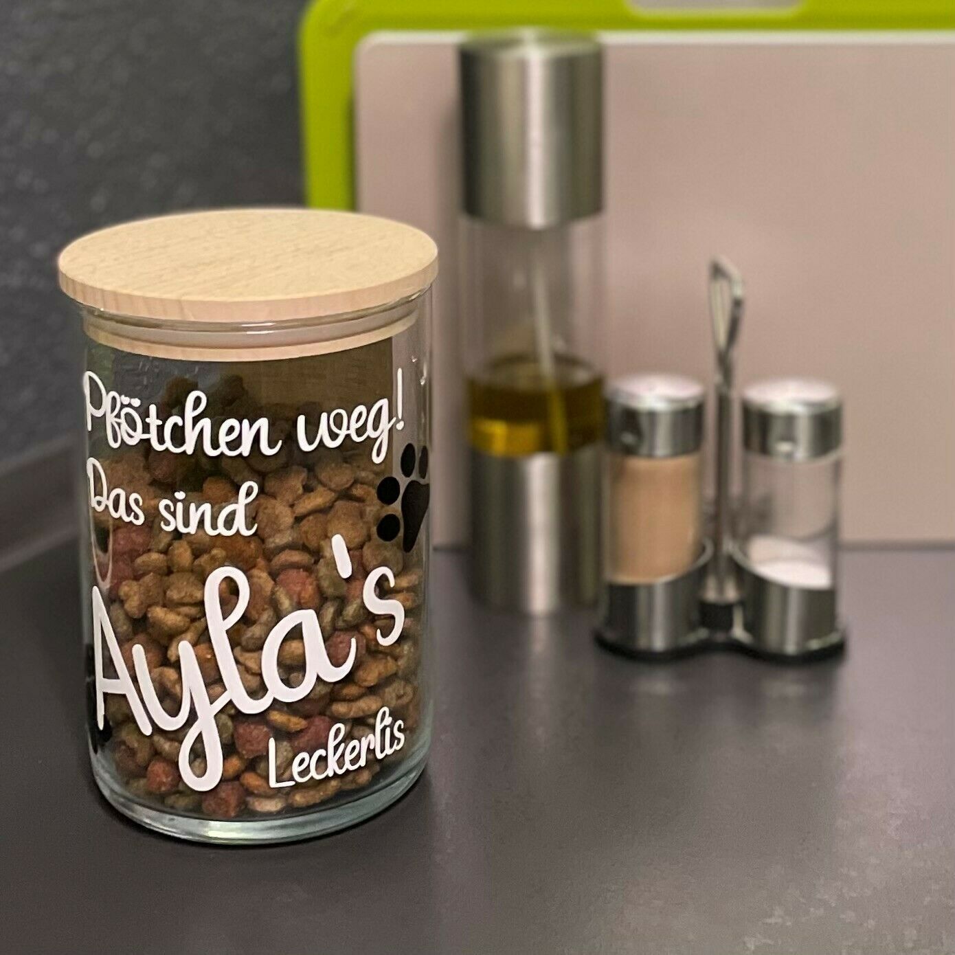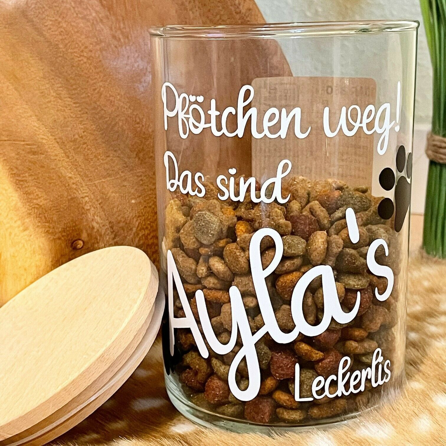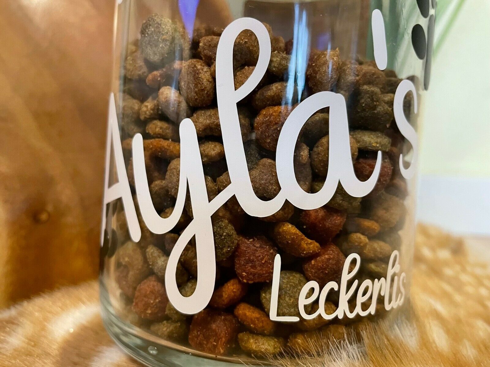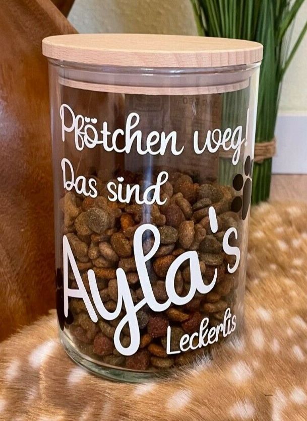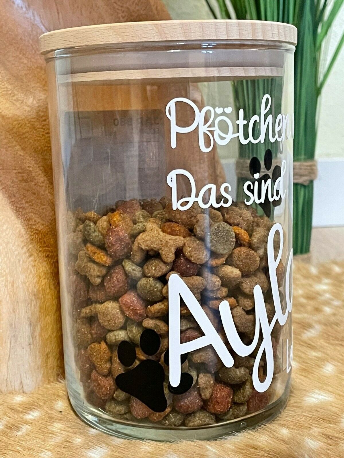 ... für Ihren Vierbeiner Vorratsglas mit Holzdeckel für Leckerchen Leckerli personalisiert Ein schönes Accessoire für die Küche, den Flur oder einen anderen Ort Ihrer Wahl. Die Leckerchen Ihres Vierbeiners sind in diesem Vorratsglas gut aufgehoben Liebevoll gestalten wir dieses stilvolle, qualitativ