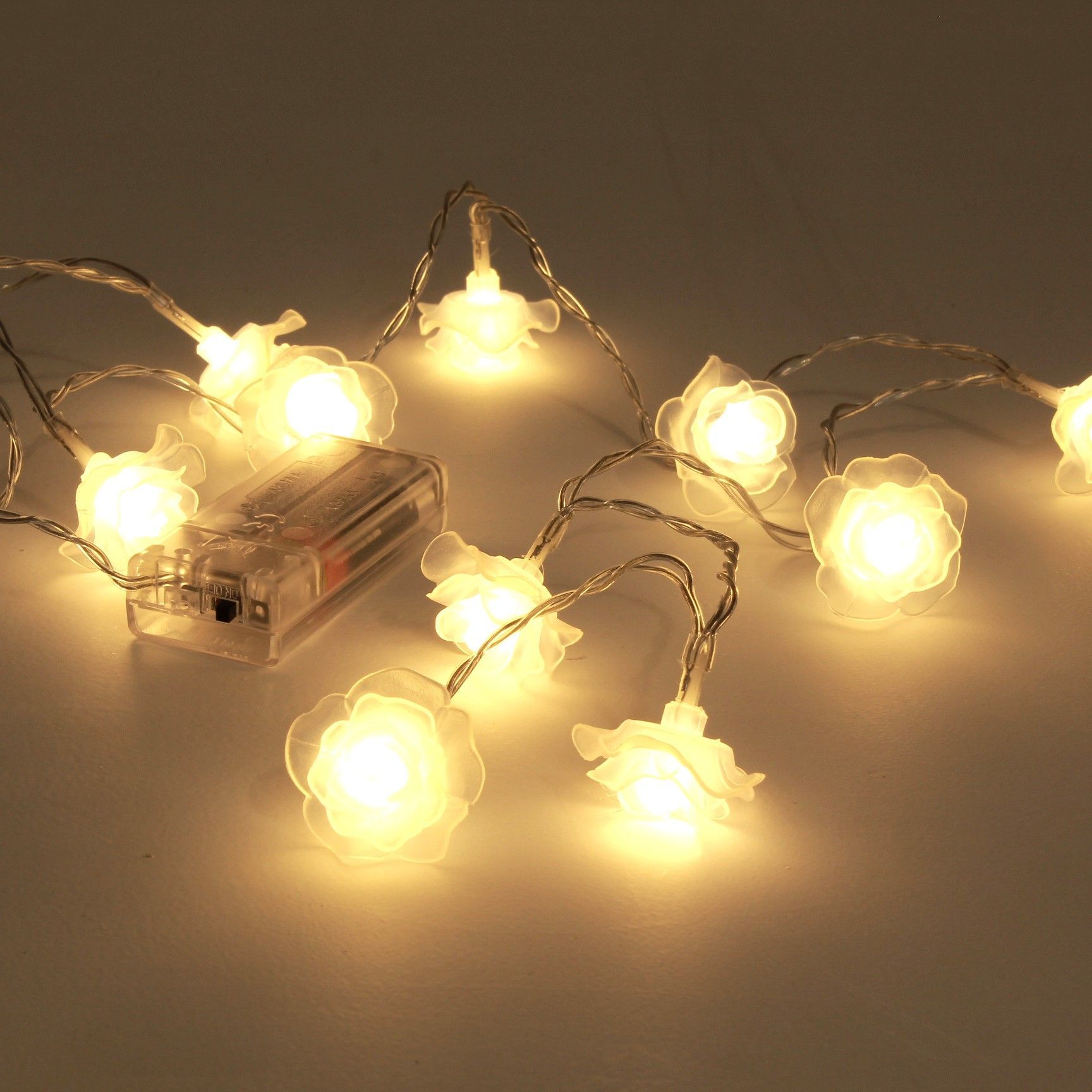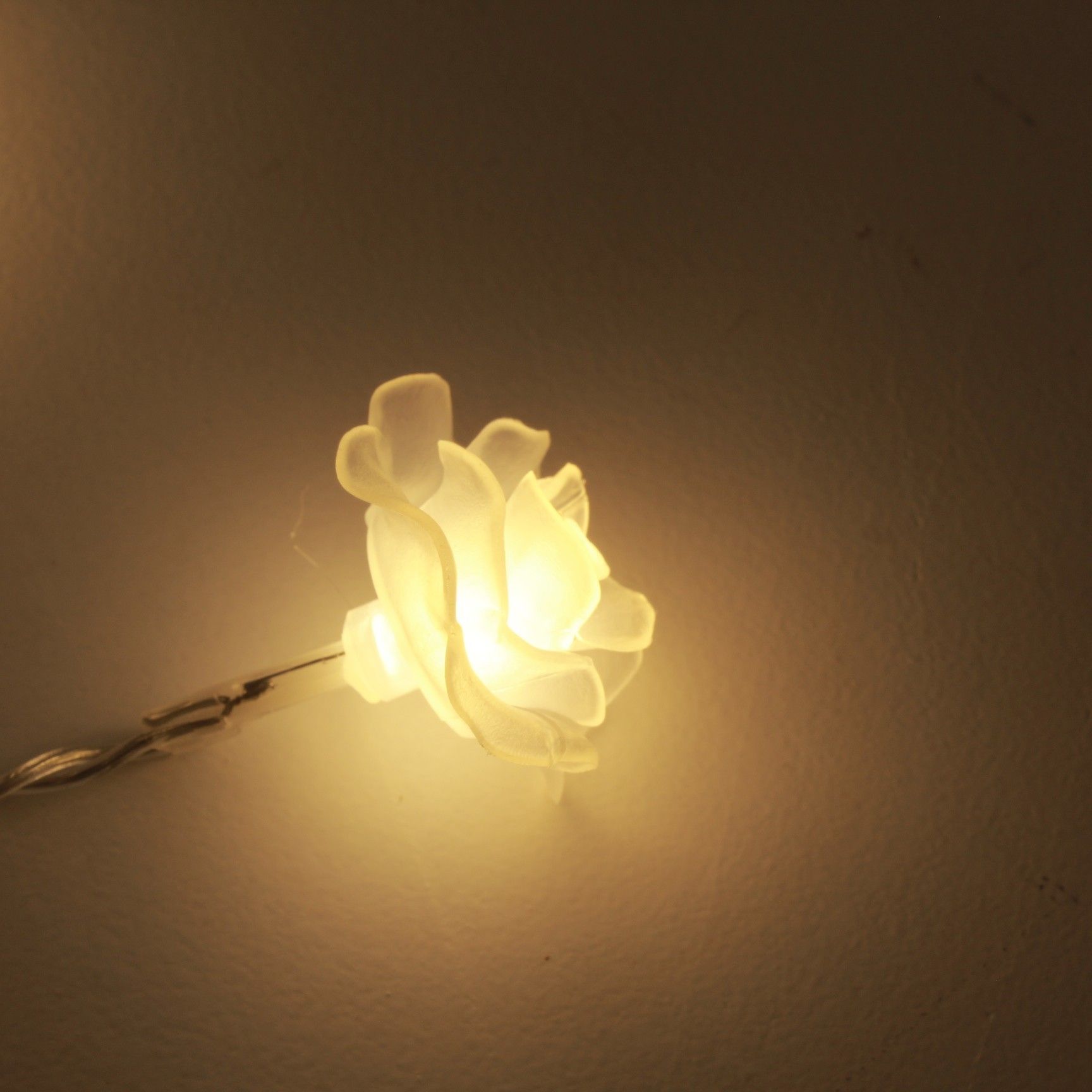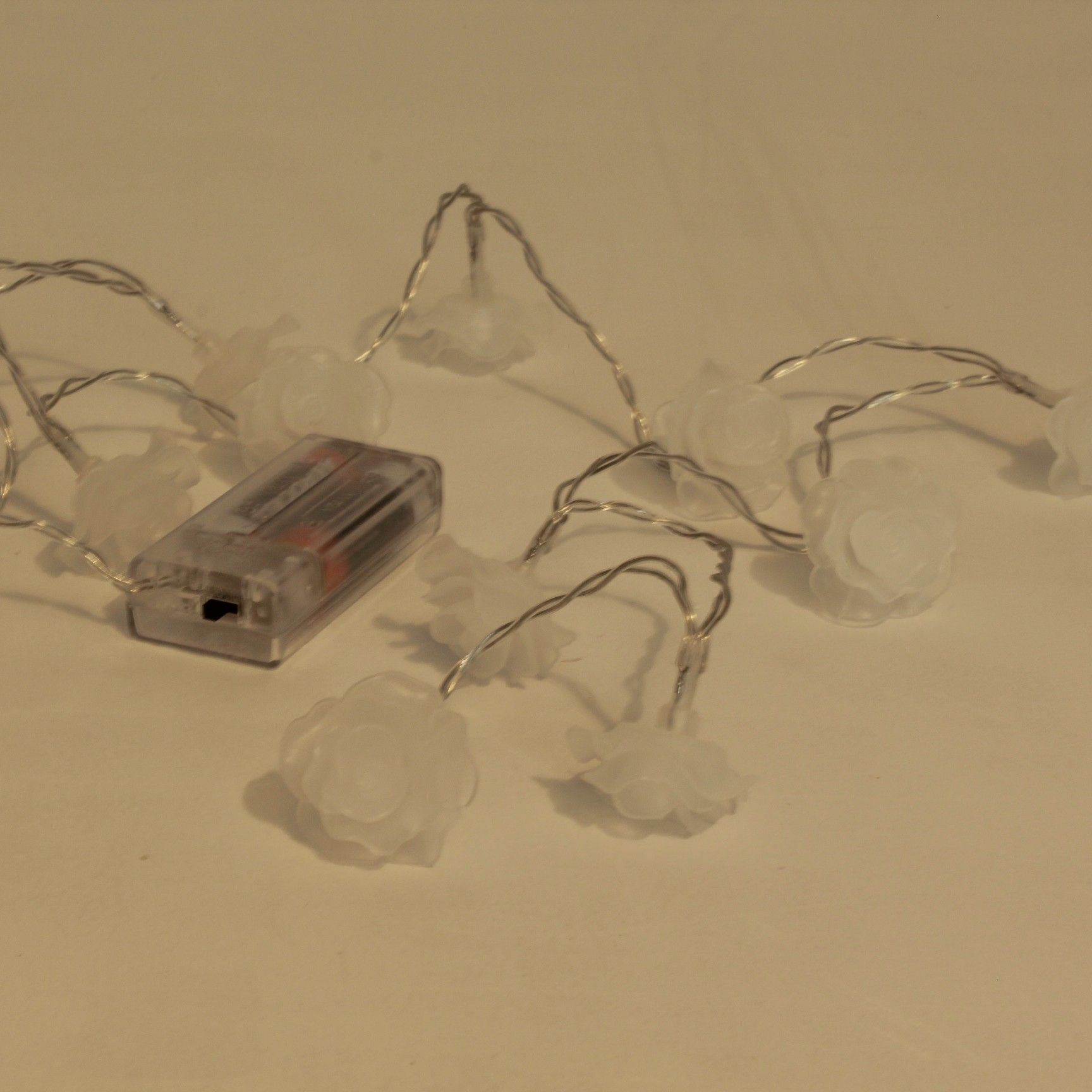 Lichterkette Rosenblüten 10er Lichterkette Länge: 120 cm Blütengröße: 3,5 cm inklusive Batterien: 2xAA Hübsche Lichterkette in Rosenblütenform. Vielseitig verwendbar wie Hochzeit, Geburtstag oder Tischdeko
