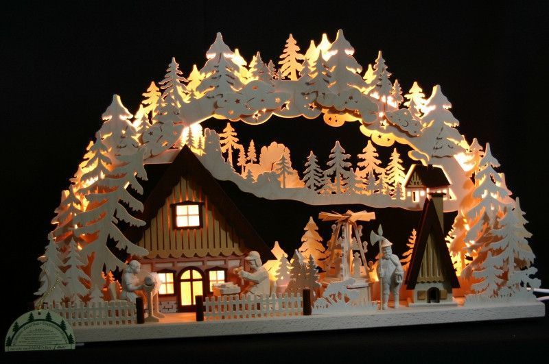 LED 3D-Schwibbogen 72x43 Pyramide + Räucherhaus Erzgebirge Weihnachten Holz