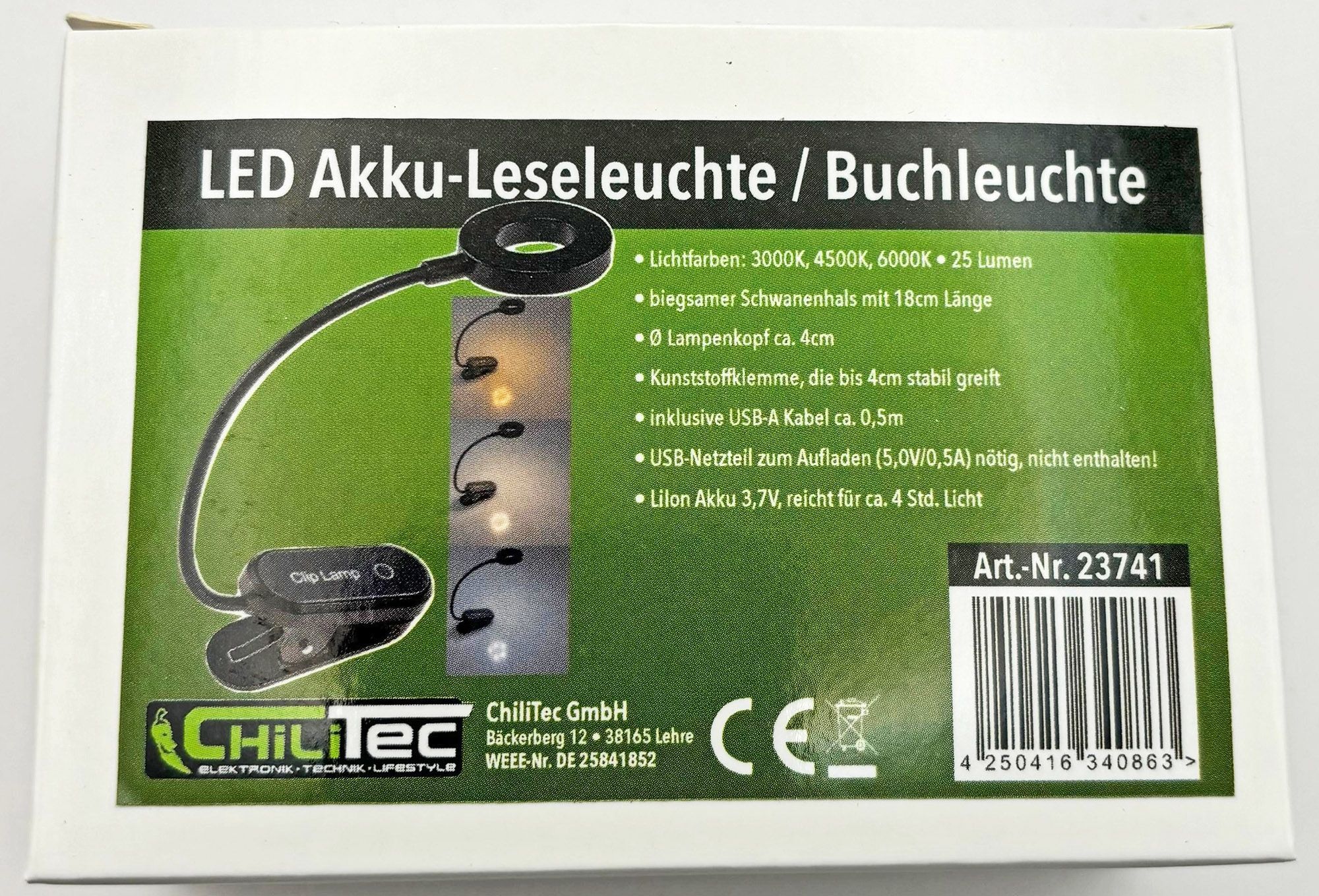 ChiliTec LED Akku-Leseleuchte / Klemmleuchte 18cm Schwanenhals, dimmbar, 25lm