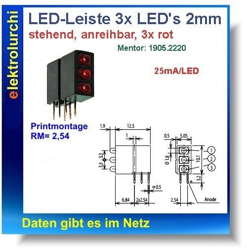 LED Array mit 3 x LED 2mm, rot, stehend, anreihbar RM2,5mm Mentor 1905.2220, 2St.
