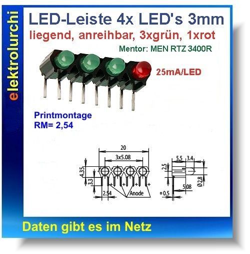 LED Array mit 4 x LED 3mm, grün/ rot liegend anreihbar RM2,54mm MEN RTZ3400R, 2St.