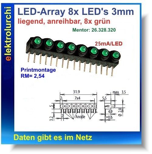 LED Array mit 8 x LED 3mm, grün liegend anreihbar RM2,54mm Mentor 2632.8320, 1St.