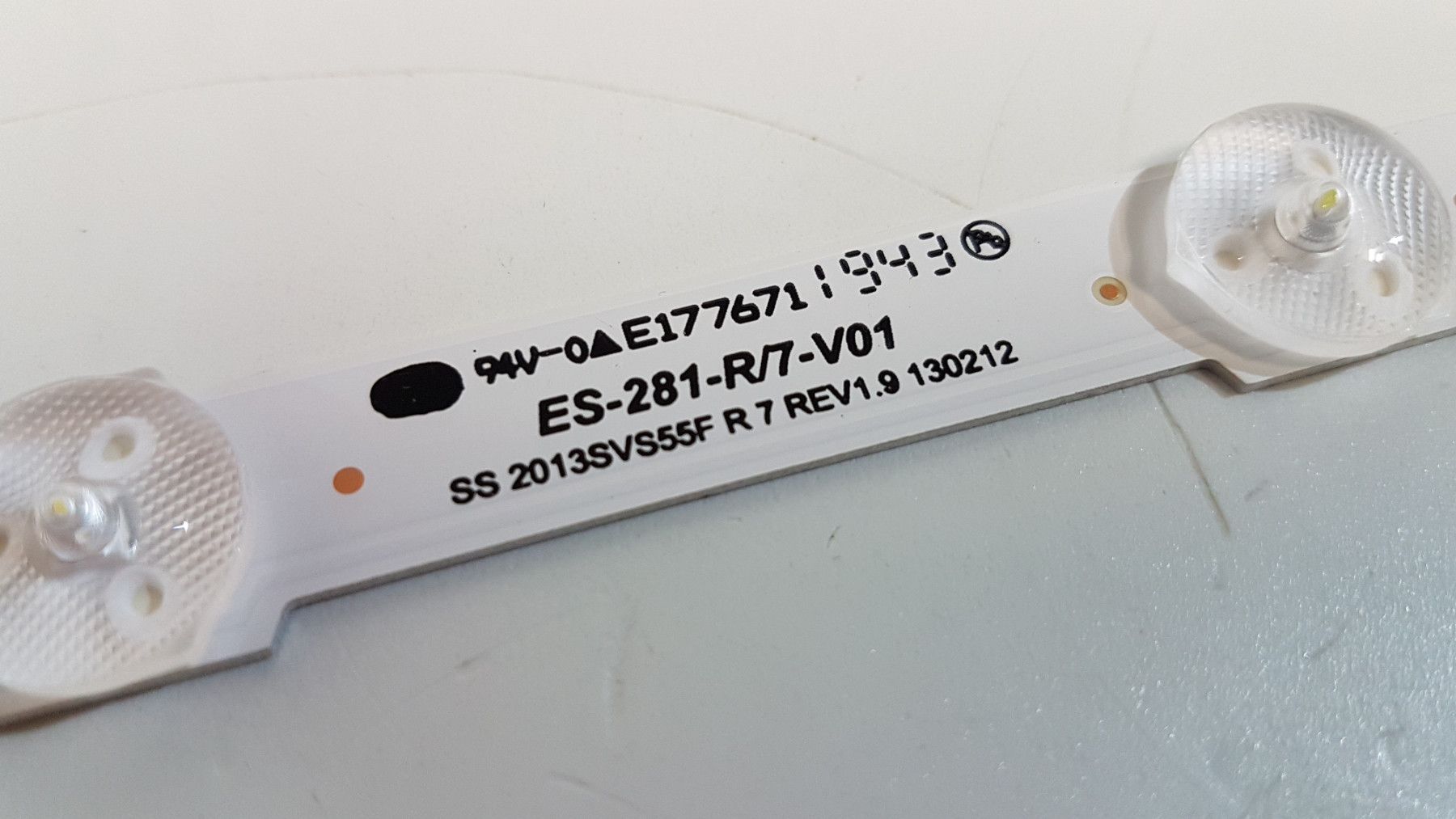 ausgebaut, funktionstüchtig LED Backlight Strip Leiste für LCD TV Typ: SS 2013SVS55F R 7 REV1.9 7 LED 467mm x 12mm Original Ersatzteilnummer: BN96-25312A Trägermaterial: Aluminium passend für das Display: GF550CSM-C1 sowie CY-HF550CSL Passend zum Gerät: UE55F6400 er und UE55F6500 er Serie Regal
