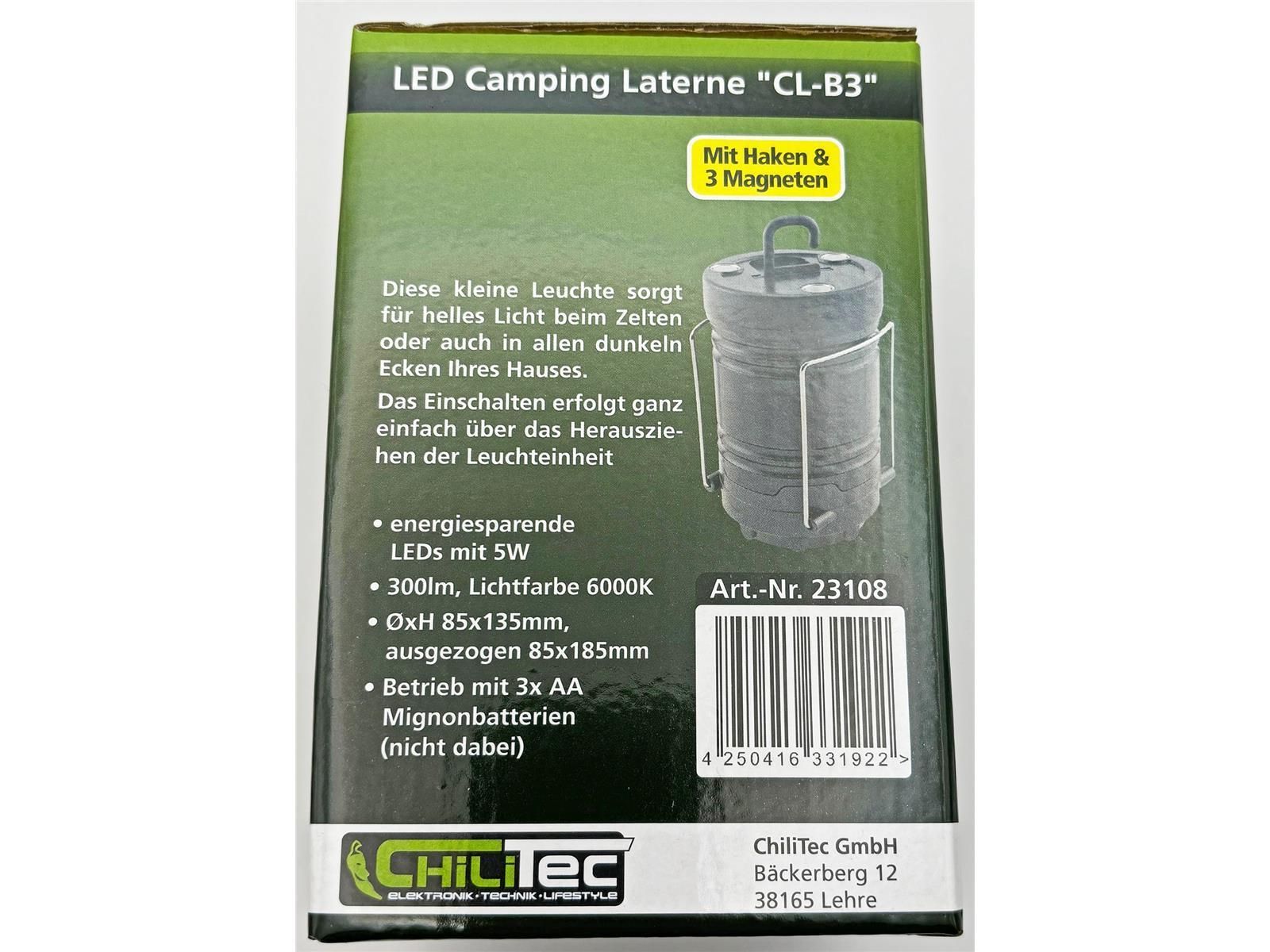 ChiliTec LED Camping Laterne "CL-B3"300lm, Batteriebetrieb, ØxH 85x135mm