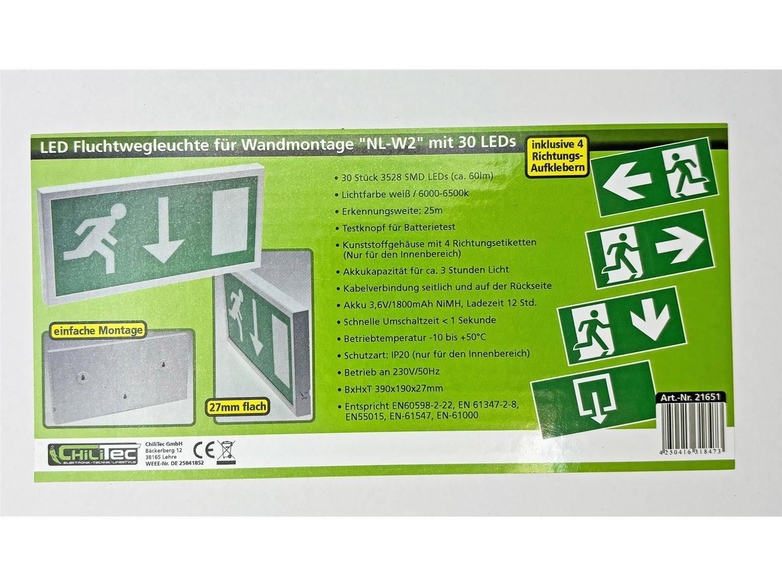 ChiliTec LED Fluchtwegleuchte "NL-W2" 30 LEDsErkennungsw. 25m, andmontage, 27mm flach