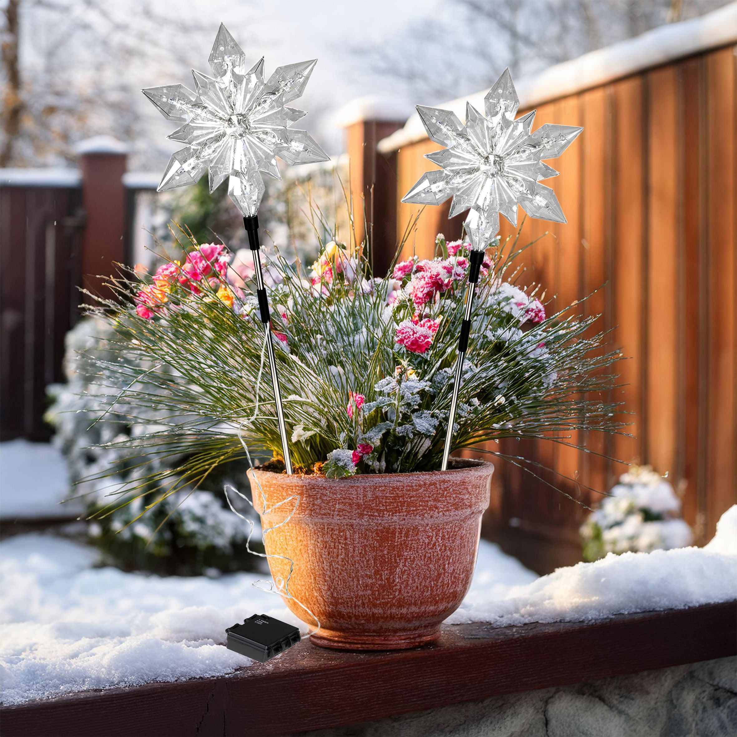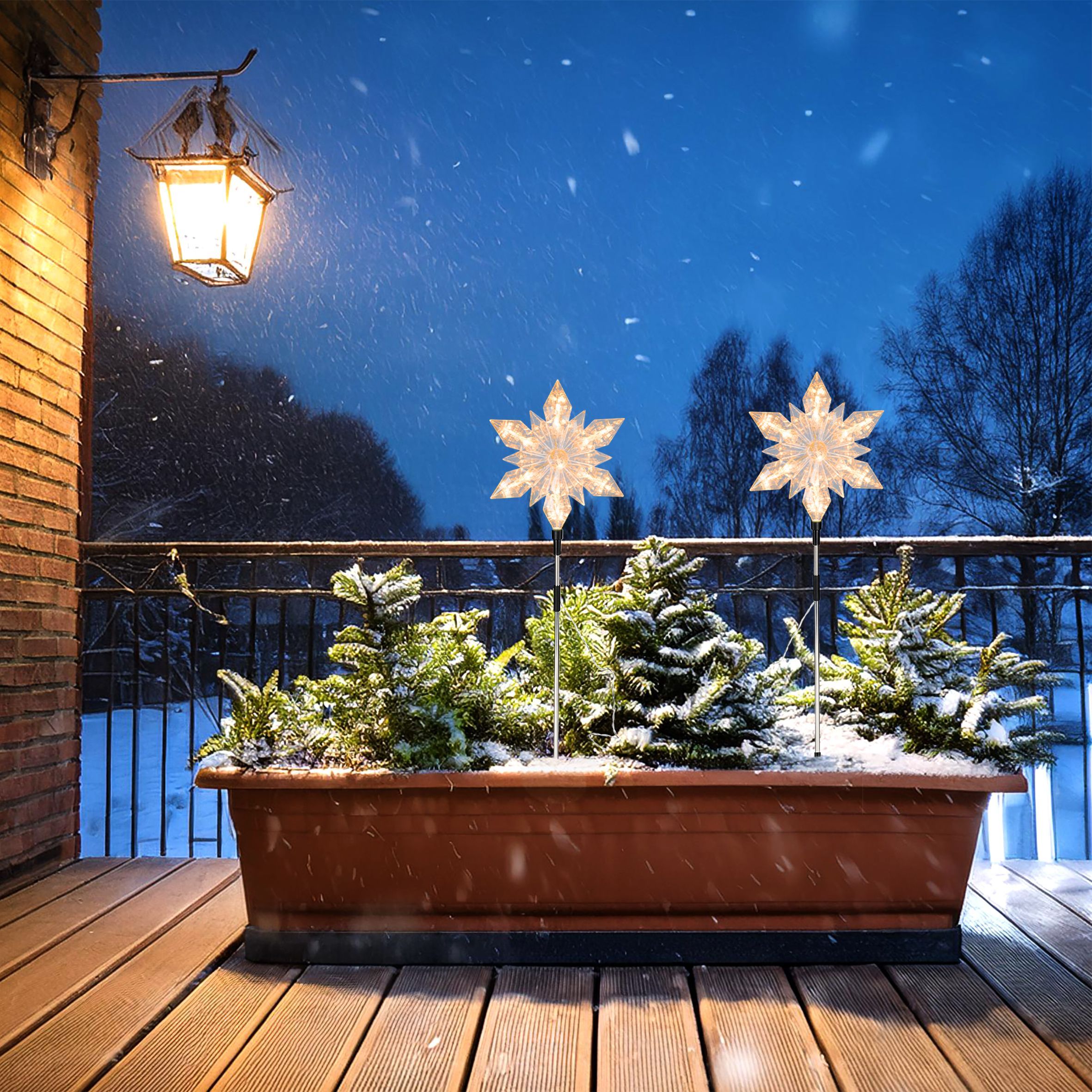 2er Set Weihnachts Gartenstecker Schneesterne mit LED in warm weiß beleuchtet Batterie betrieben mit Timer