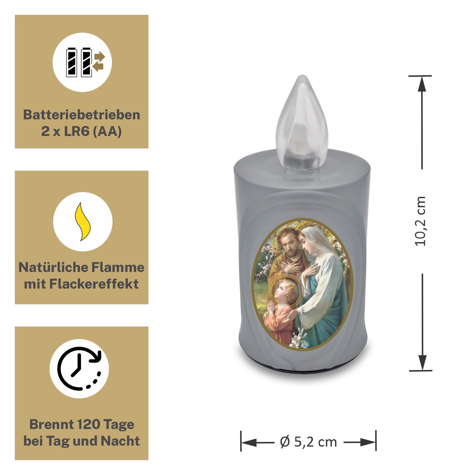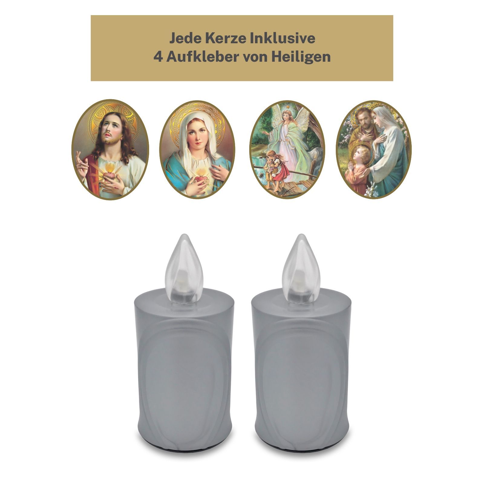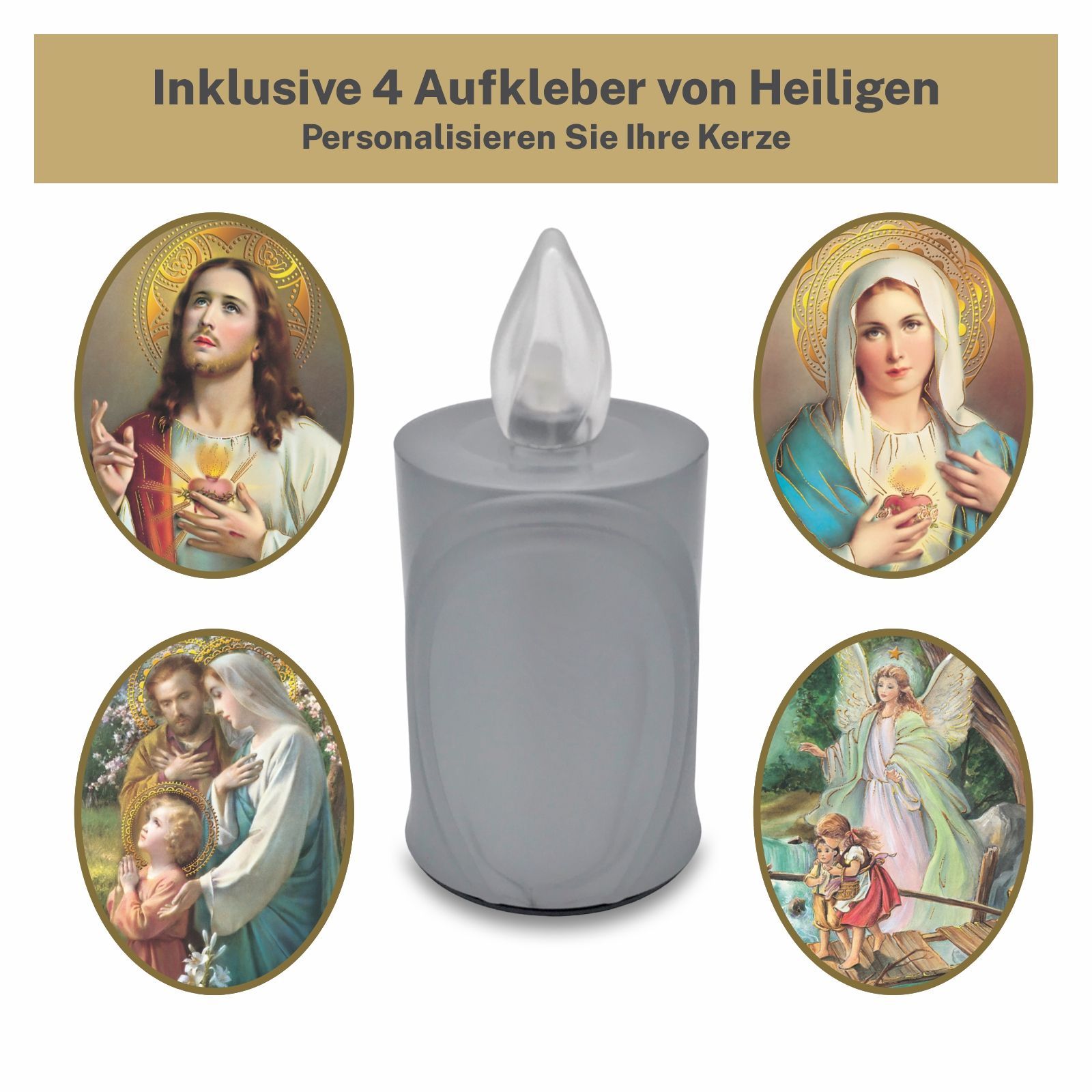 LED Grabkerze Flackereffekt lange Brenndauer silber inkl. Auswahl an Heiligen