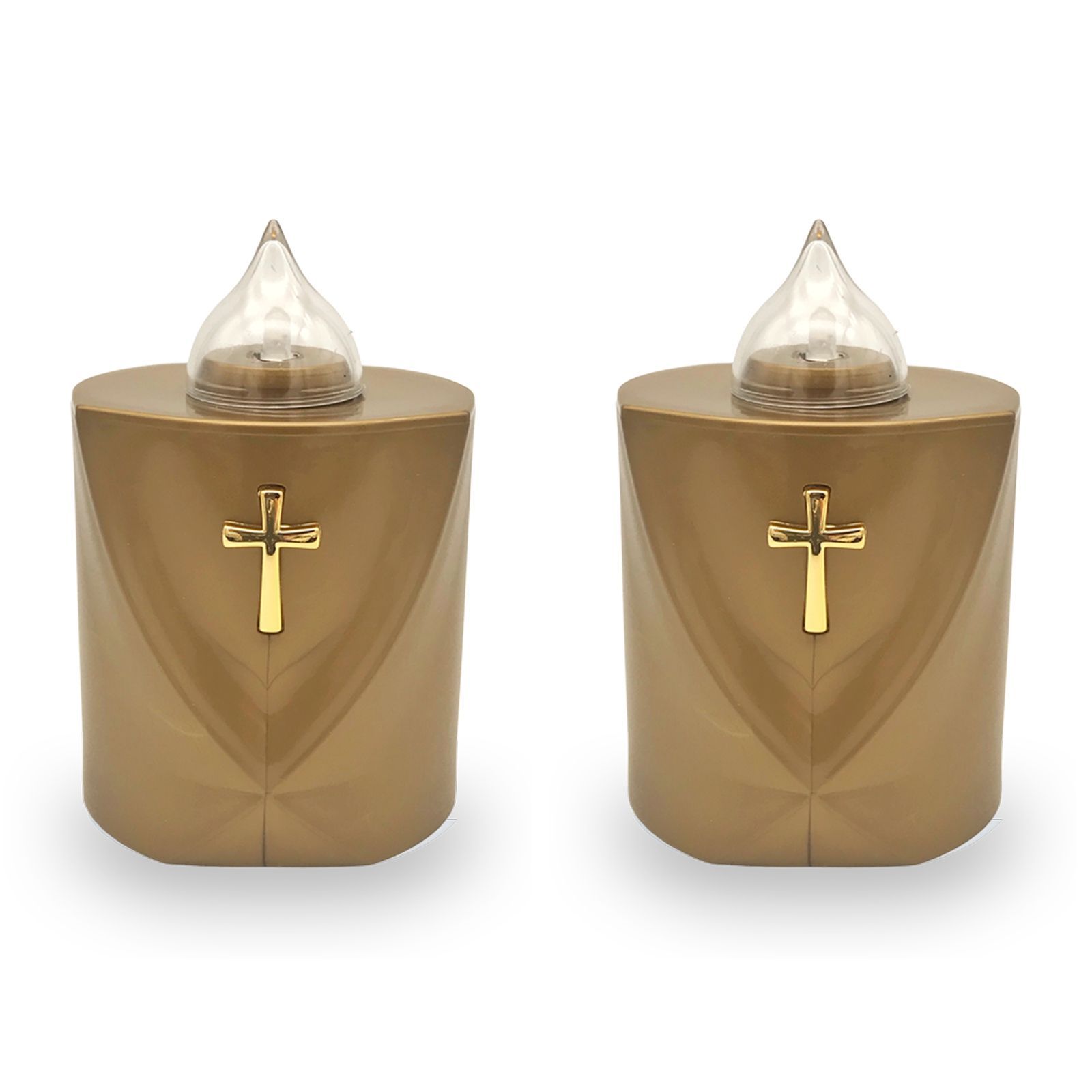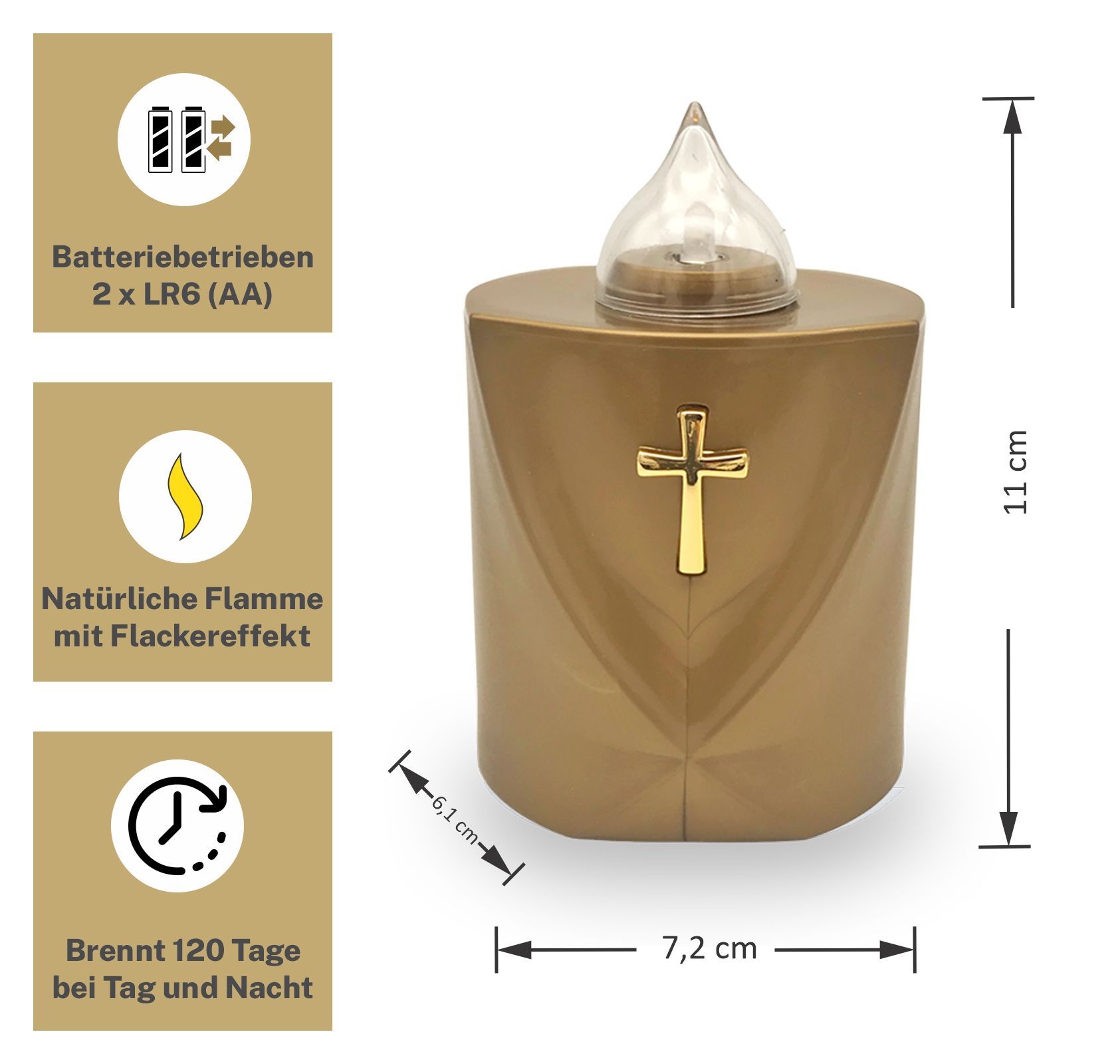LED Grabkerze Flackereffekt lange Brenndauer Trauerlicht gold Heiliges Kreuz