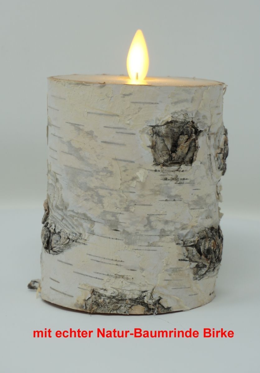 • CBK-MS LED Kerze Stumpenkerze Höhe 10 cm mit echter Natur-Baumrinde BIRKE HELL