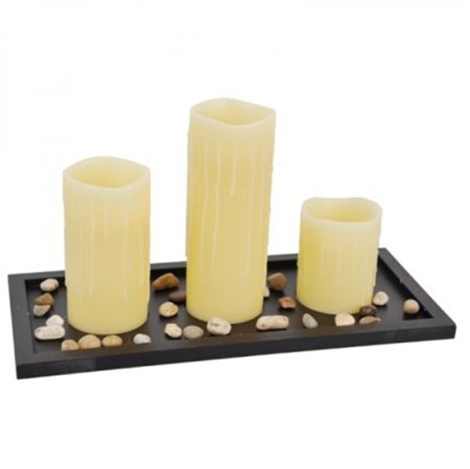 LED-Kerzen 3er-Set auf Tablett mit Dekosteine Wachskerzen Stumpenkerze Vanille