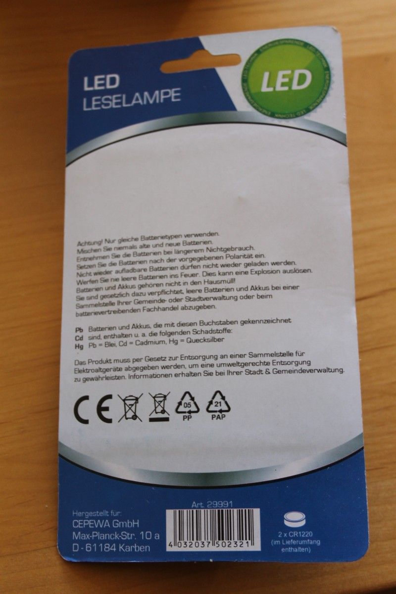 LED-Leselampe mit energiesparender Technik. Beachten Sie bitte die Hinweise auf der Rückseite der Verpackung. Neig - und schwenkbar in alle Richtungen. Hinweis gem. Batteriegesetz Informationen gemäß § 18 Abs. 1 Batteriegesetz zur Rücknahme von Altbatterien und Akkus Batterien Akkus dürfen nich
