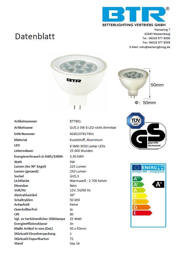 LED Leuchtmittel GU5,3 Leistung 3W 250 lm, 8 LED Energiesparlampe