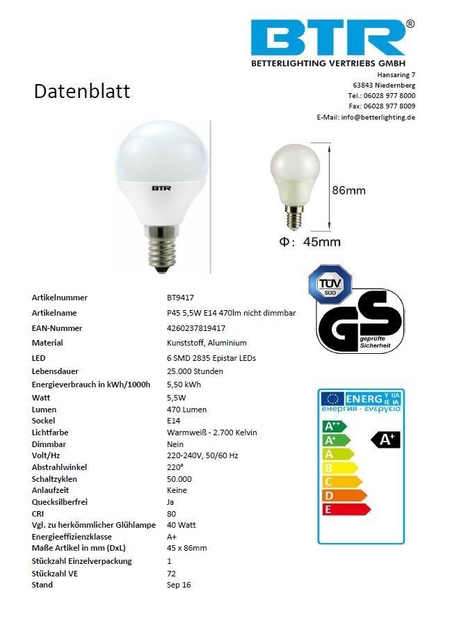 LED Leuchtmittel P45, 5,5W, E14, 470lm Non-Dim, warmweiß, Energiesparlampe