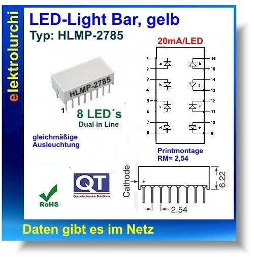Sie bieten hier auf folgenden Artikel 1 Stück LED Light-Bar 8x LED gelb, 25mA, 8,89 x 19,05mm, Broadcom HLMP-2785 LED-Light-Bar von Broadcom, rechteckig mit flachem Oberteil und gleichmäßiger Ausleuchtung Farbe: gelb Montage: Durchsteckmontage Durchlassspannung: 2.1V Durchlassstrom If: 25mA Raster: