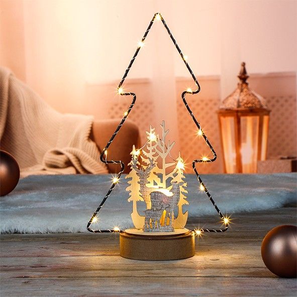 LED Metall Tannenbaum mit Holzdeko ca. 18 x 9,5 x 30,7cm mit 20 warmweißen LED
