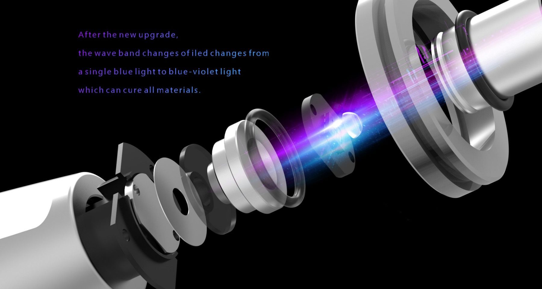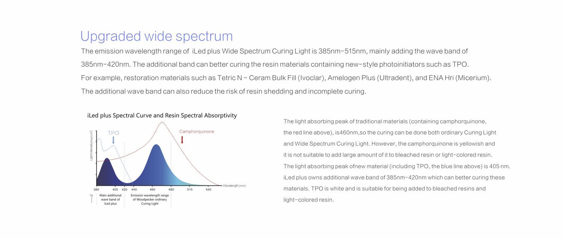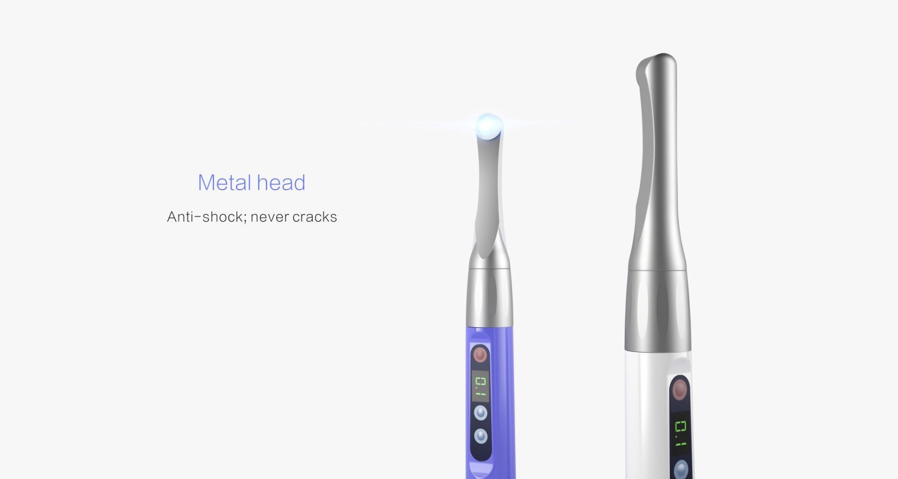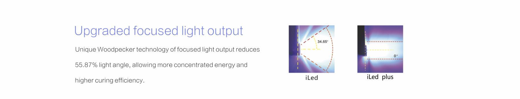 LED Polymerisationslampe iLED PLUS (Metal Head), kabellos original Woodpecker ansprechendes und ergonomische Design 1 Sek zum Härten (2mm Komposit) im High Power Modus 2 Arbeitsmodi - Turbo Power Modus 1 3Sek 2300-2500mw cm2 - Norm Power Modus 5 10 15 20 Sek 1000-1200mw cm2 Kopfstück um 360° dre