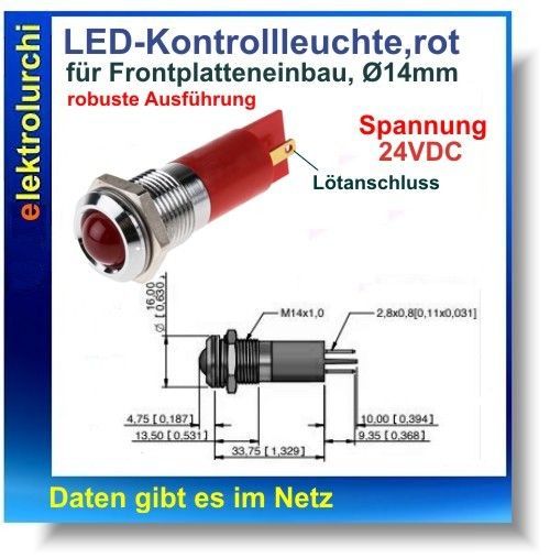 Sie bieten hier auf folgenden Artikel NEU 1 Stück LED-Signalleuchte, Kontrollleuchte rot 24 V DC, 14mm, 30mcd Hochwertige professionelle LED-Anzeige. Kompakte und robuste Bauweise mit einem Flachsteckeranschluss. sehr zuverlässig und von ausgezeichneter Qualität. LED Farbe: rot Gehäusefarbe: Chrom g