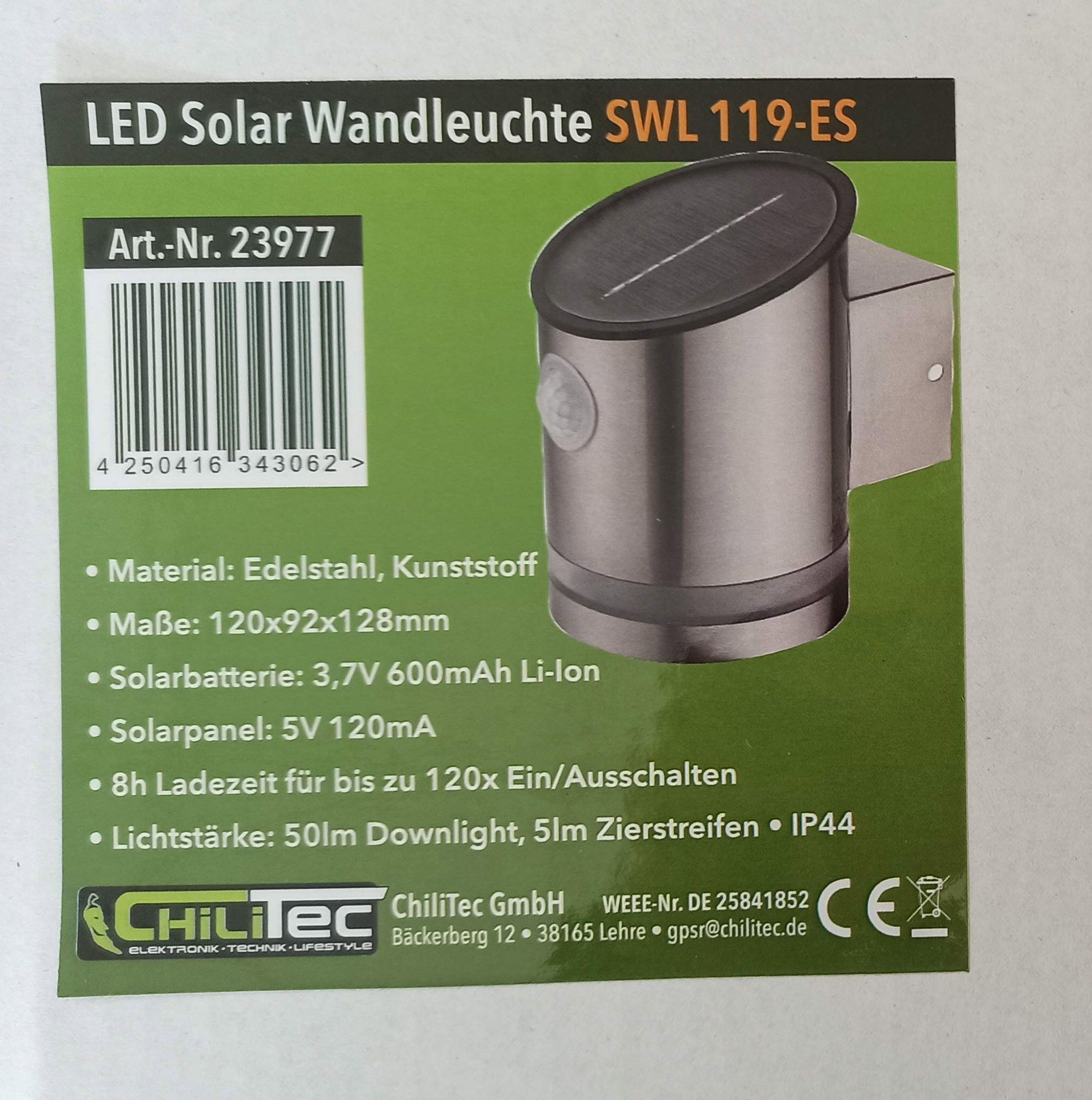 ChiliTec LED Solar Wandleuchte "SWL 119-ES" PIR Bewegungsmelder, IP44, Edelstahl