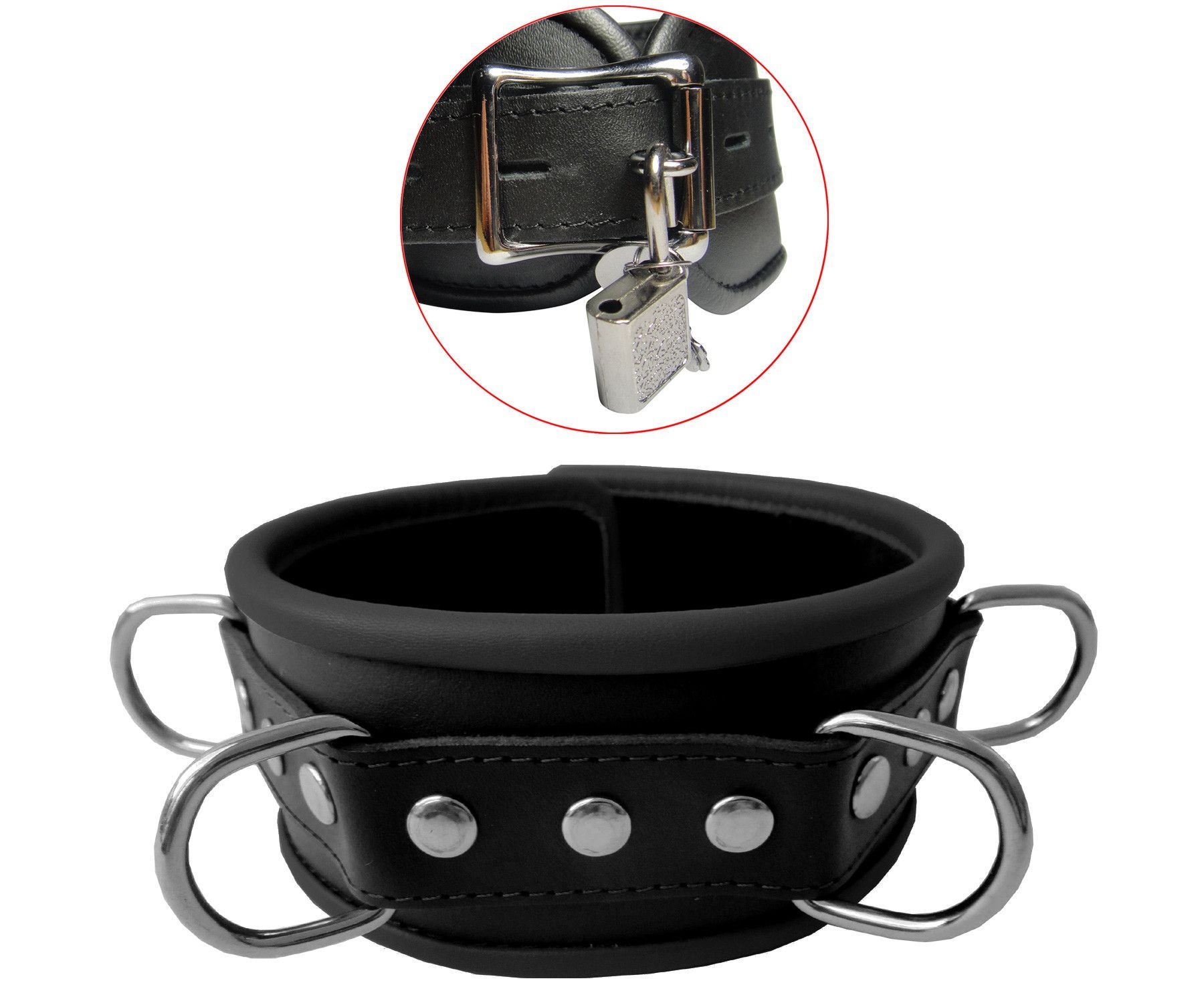 Gepolstert. In schwarz. Material: Rindsleder. Mit abgerundeten Kanten. Unfassbar robustes Halsband. Innen mit weichem Nappaleder gepolstert. Abschließbare Variante.(Schloss inklusive). Das Halsband ist mit 4-D Ringen ausgestattet. Maße: Länge Polster: 42cm. Breite Polster: 55mm. Bondage Leder Halsbä