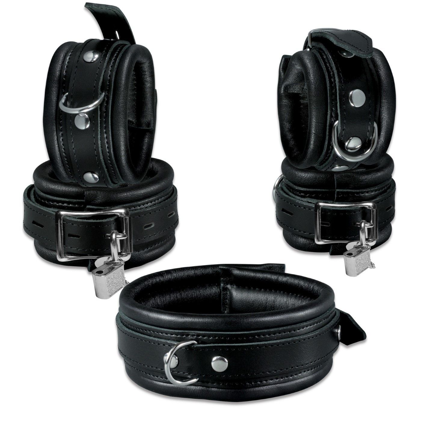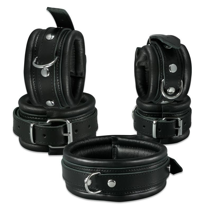 Mit D-Ring. Farbe: Schwarz. Material: Rindsleder. Inkl. 2 Doppelkarabiner. Innen mit weichem Nappaleder gepolstert. Maße: Halsband: Länge Polster: 42cm. Breite: 5,0cm. Fußfesseln: Länge Polster: 29cm. Breite: 5,0cm. Handfesseln: Länge Polster: 21cm. Breite: 5,0cm. Unsere Leder Bondage Sets werden Si