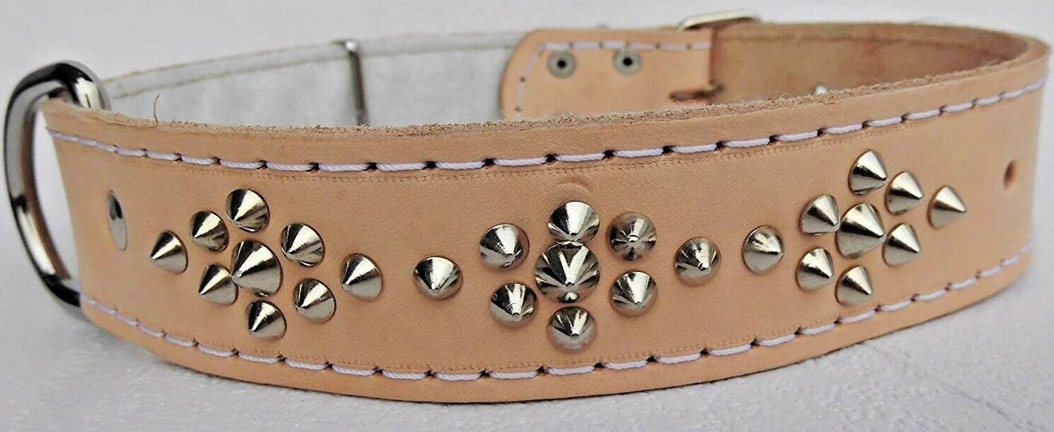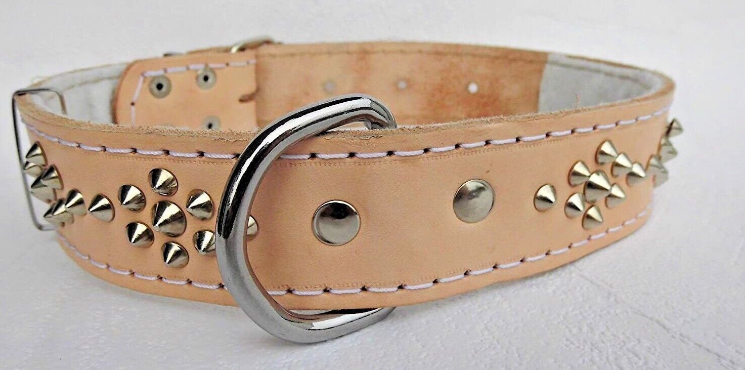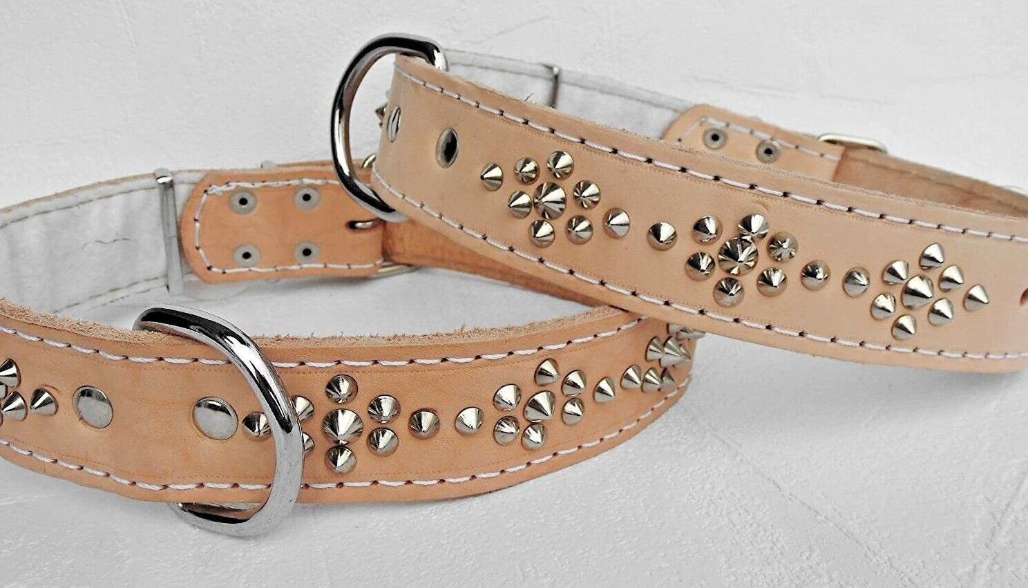 Lederhalsband mit Nieten Maße: Gesamtlänge : 64 cm Halsumfang : 42 - 57 cm Breit : 40 mm Messen Sie hierzu bitte den Hals ihres Hundes. Material : - 100 % hochwertiges Leder, sehr robust - NATUR, verziert mit runden Kopfnieten - vernäht und gepolstert mit weichem Futterstoff Bitte beachten Sie auch