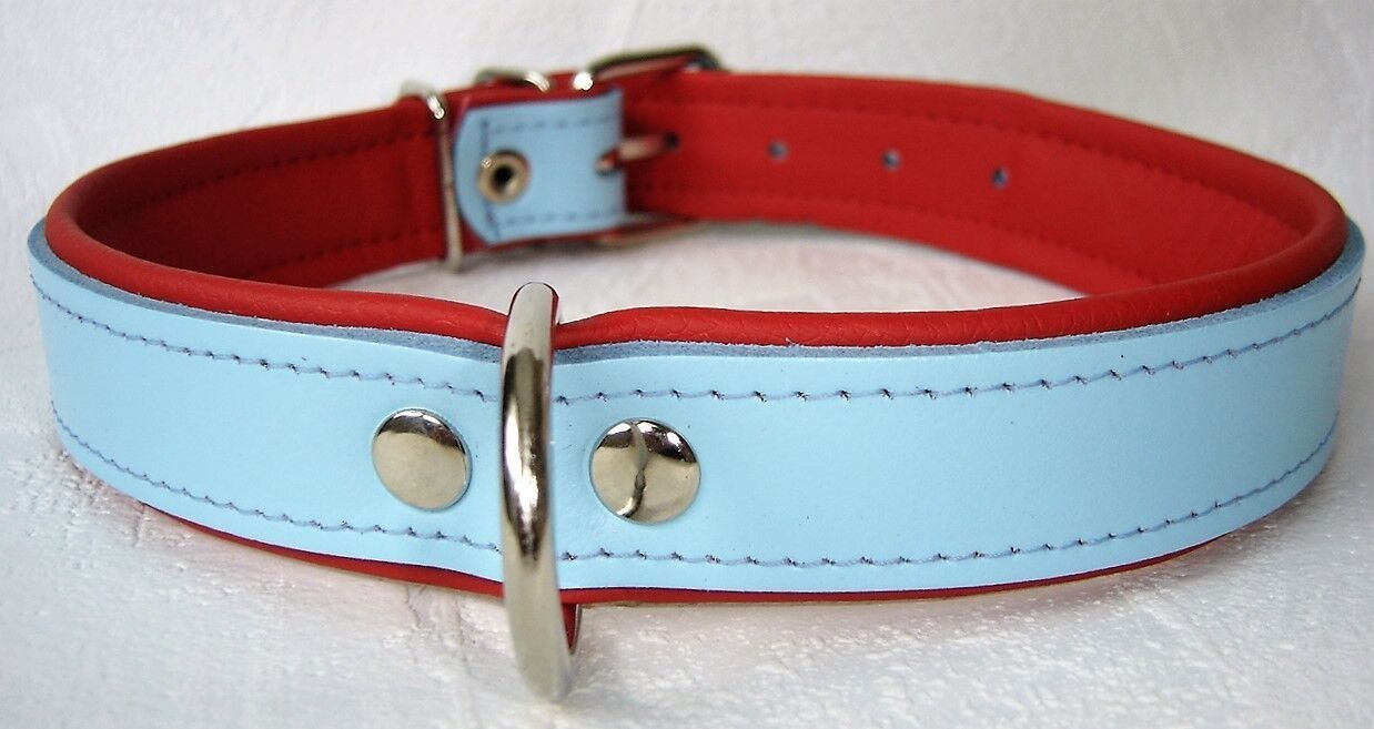 Lederhalsband ***Blau - ROT *** Maße: Gesamtlänge : 40 cm Halsumfang : 28 - 36 cm Breit : 27mm Messen Sie hierzu bitte den Hals ihres Hundes. Material : - 100 % hochwertiges Leder, sehr robust - ausen Blau - Leder - von innen mit weichem rotem Eko - Leder gefüttert, - solide Arbeit. Bitte beachten S