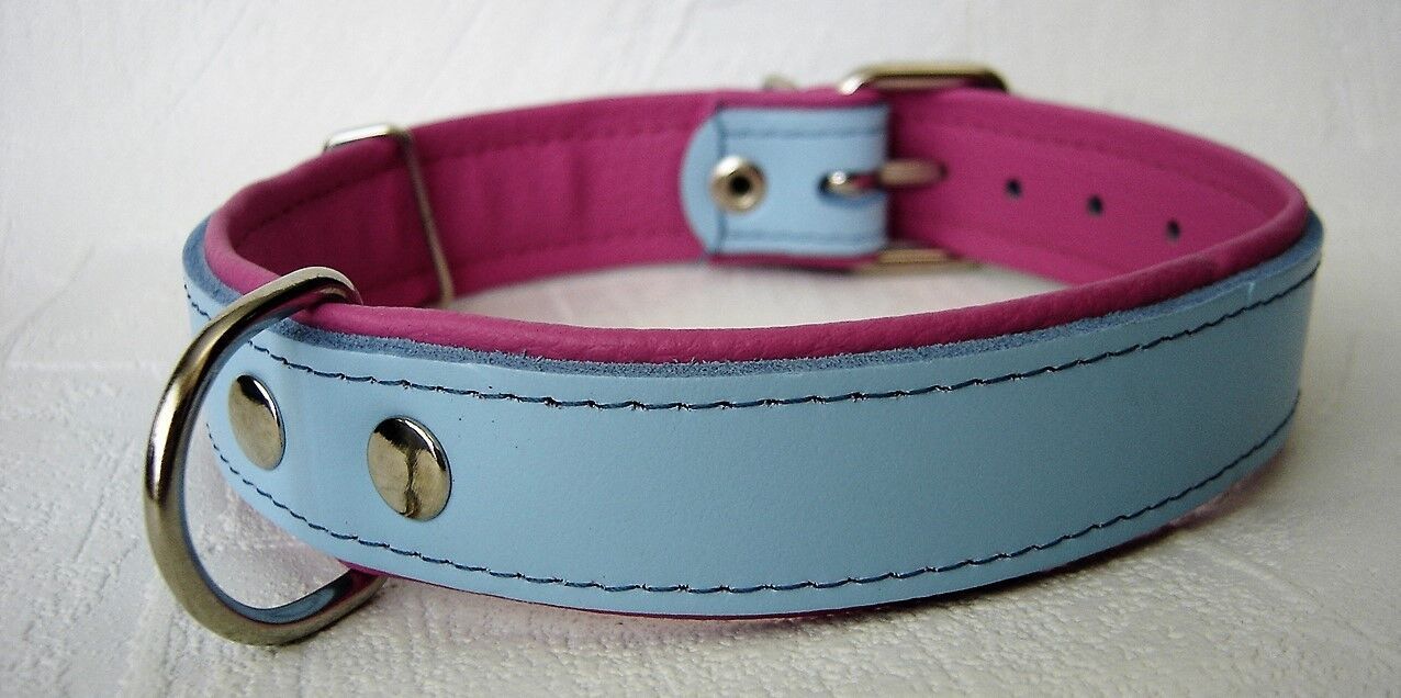 Lederhalsband ***Blau- Rosa *** Maße: Gesamtlänge : 63 cm Halsumfang : 46 - 57 cm Breit : 35 mm Messen Sie hierzu bitte den Hals ihres Hundes. Material : - 100 % hochwertiges Leder, sehr robust - ausen Blau - Leder - von innen mit weichem rosa Eko - Leder gefüttert, - solide Arbeit. Bitte beachten S