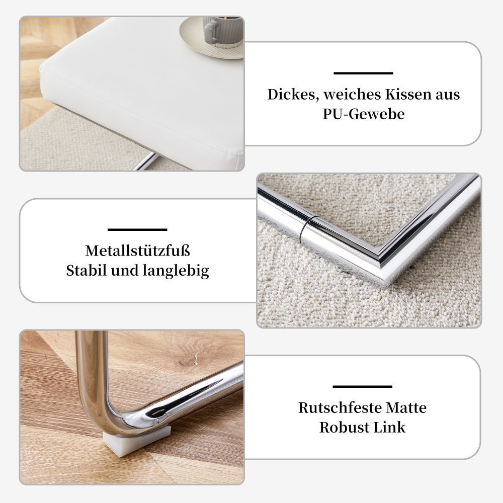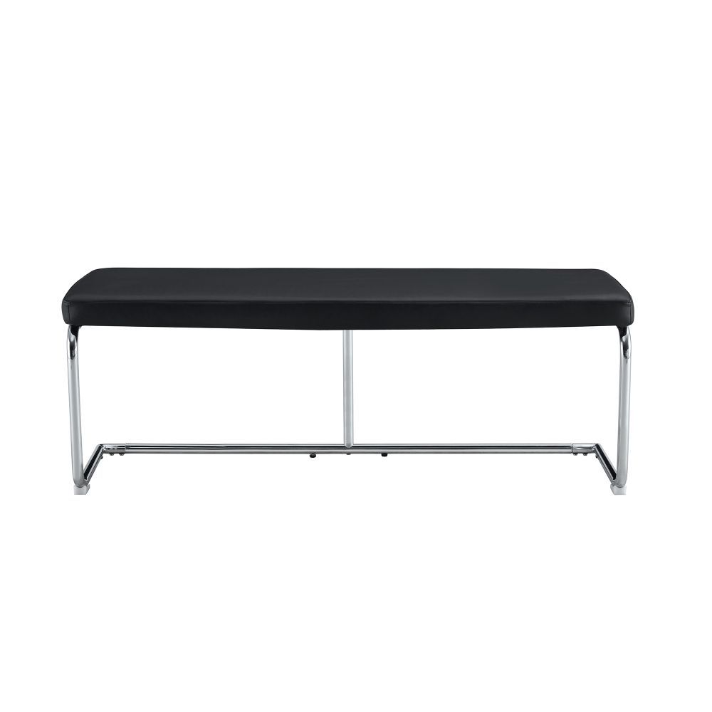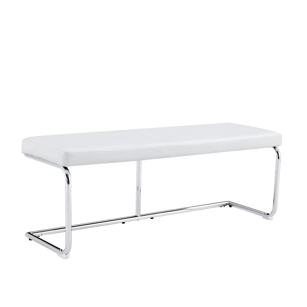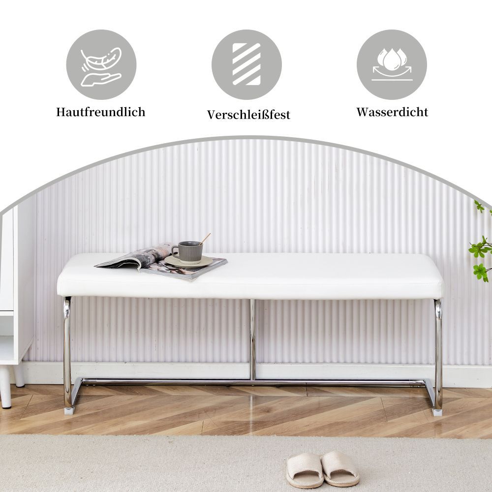 Moderne Sitzbank mit gepolsterter Oberfläche aus PU und stabilem Metallgestell in verchromter Optik. Ideal für Schlafzimmer, Flur oder Wohnbereich. Das elegante Design bringt Komfort und einen zeitgemäßen Stil in verschiedene Wohnräume.