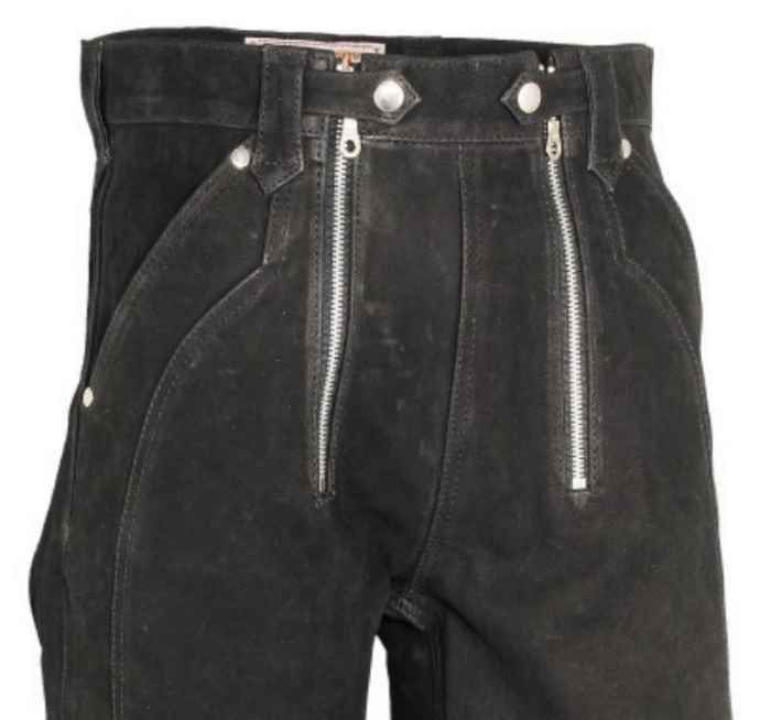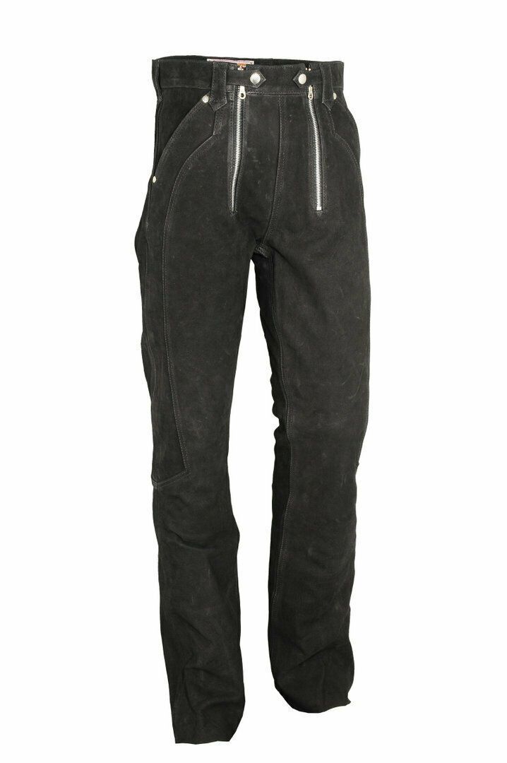 Lederjeans Fuente deluxe Nubukleder schwarz Lederhose Fuente deluxe im Carpenter-Stil mit markantem Doppelreißverschluss an der Front. Die perfekte und bequeme Passform machen die Hose zu einem idealen Begleiter in der Freizeit und beim Hobby. Die Hose ist bis zum Knie mit 100 % Polyester-Innenfutte