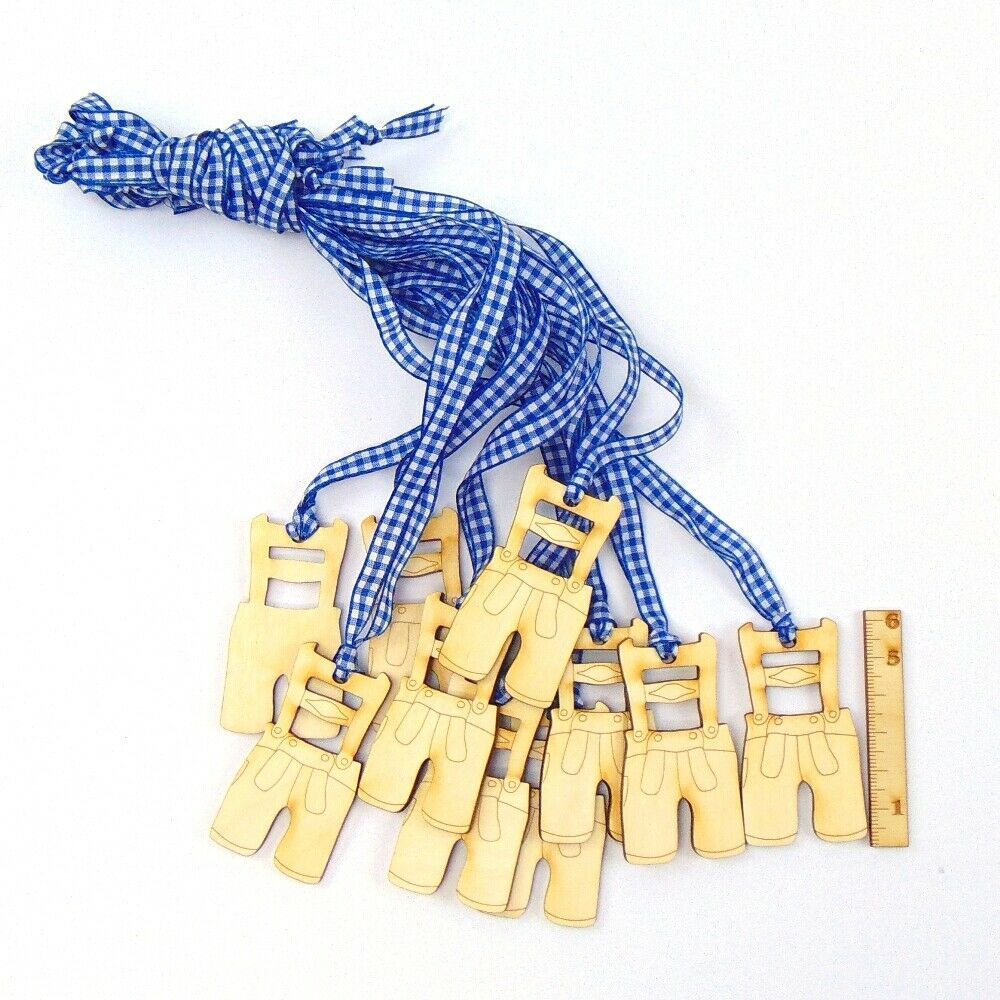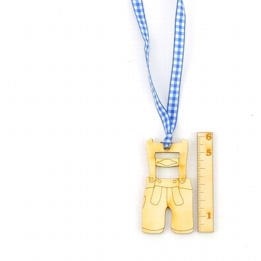 Lederhosen mit blau kariertem Band. 10 Stück 6cm. aus 3mm Birkensperrholz gelasert. Die Lederhose ist 6cm Hoch Eignet sich gut zur Dekoration auf Geschenken oder als Kette um Hals.