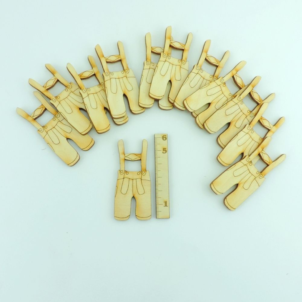 Lederhosen/ Restposten Die Tracht ist aus 3mm starkem Birkensperrholz gelasert. Anzahl: 12 Stück Höhe: 6cm Farbe: Natur Material: Birkensperrholz Hergestellt in Deutschland