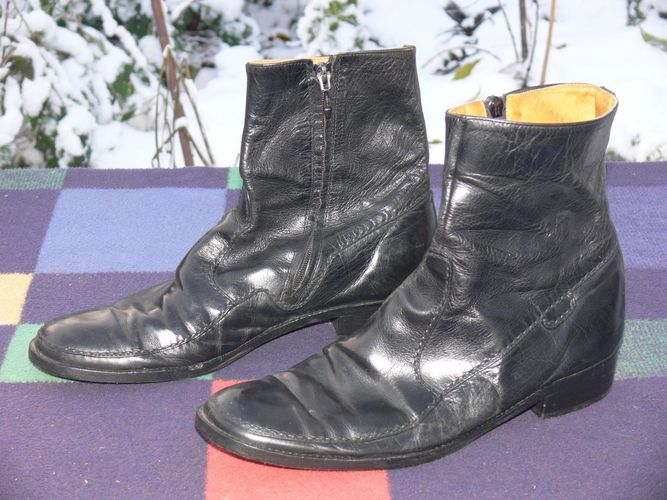 Lederstiefel schwarz, glatte Ledersohle, Größe 42 Es sind schöne Stiefel. Das Obermaterial dürfte Leder sein und anscheinend auch der vordere hellbraune Teil der Sohlen, siehe Bild 5. Leider ist die Sohle dort so glatt, dass man bei Eis und Schnee sehr rutschen würde. Die Stiefel sind also wohl nich