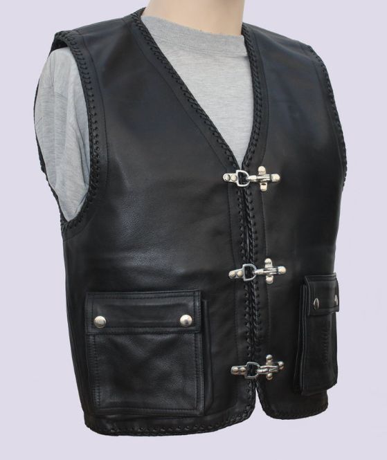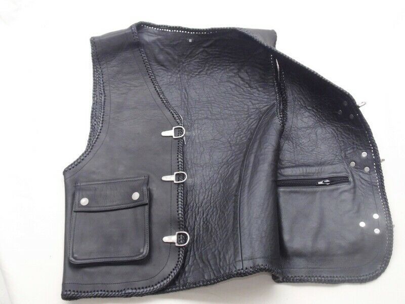Lederweste Skorpion Club schwarz Motorrad Lederweste aus hervoragendem und robustem Rindnappaleder mit umkordelten Außenkanten in exzellenter Qualität. Die markanten Metallschließen und die beiden aufgesetzten Außentaschen mit Druckknöpfen prägen den unverwechselbaren Look dieser klassischen Lederku